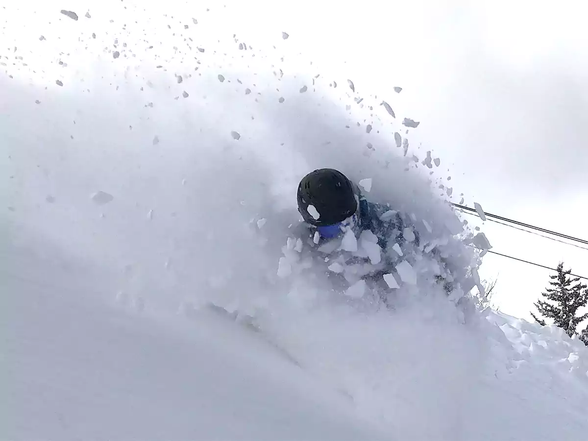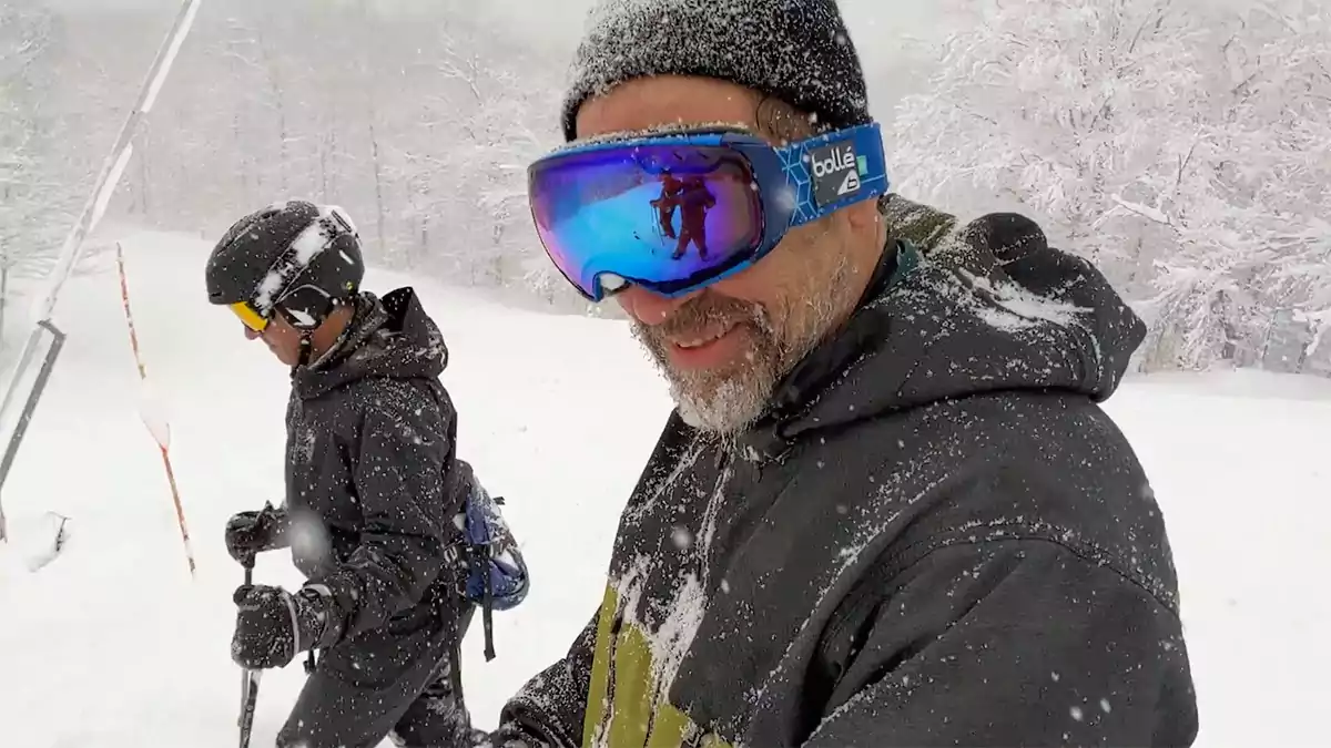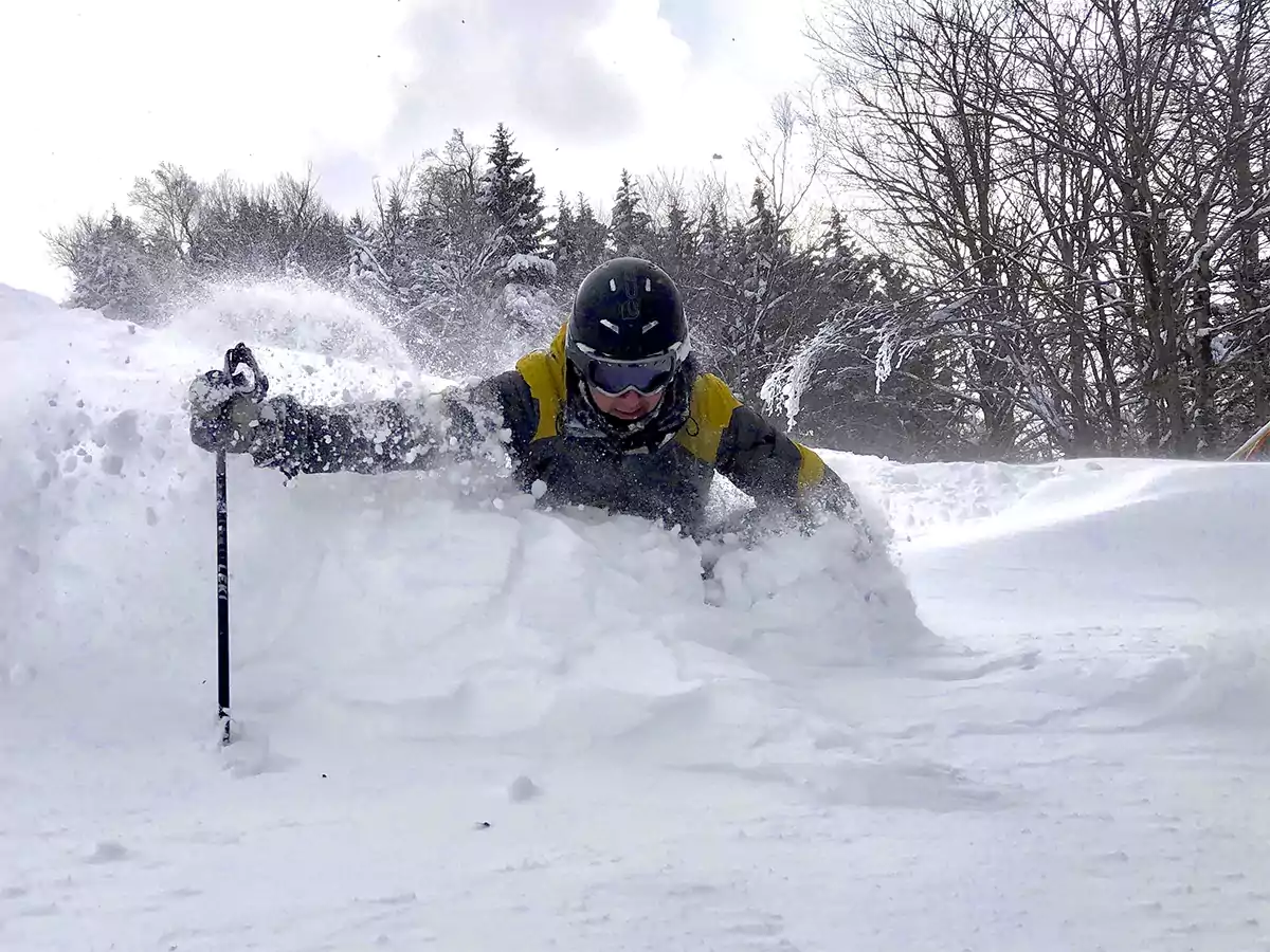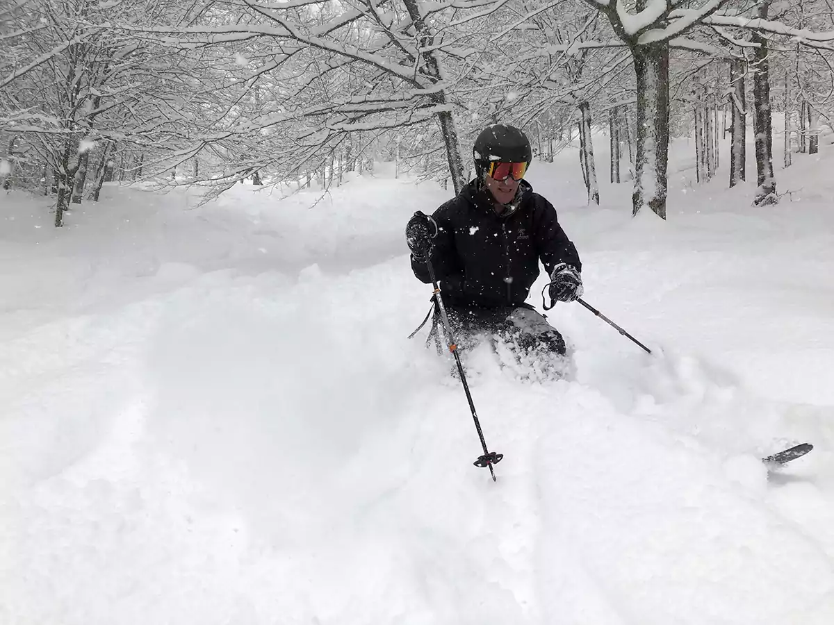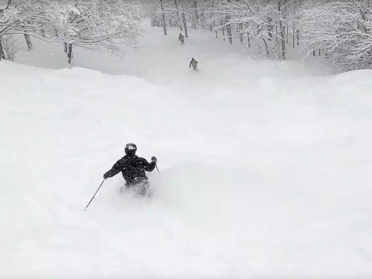 I think the photos speak for themselves. They did in fact drop the ropes, and it was pure heaven. Otis greeted us at the old Hall double chair, and within an hour he was collecting snow in his curly hair and beard at such a rate it seemed like he might turn into a yeti. While that chair hauled us up the mountain, we would discuss what to hit next, and the most common answer was "let's do that again". Yes, we ran a single trail or glade 5 times in a row that day on multiple occasions. We rode the center of the trail, then we spotted that we could ride the edge up a hill and just send ourselves down a twiggy steep cliff and somehow straight-line the drop and miraculously survive with the aid of nature's fluff, and then the next run we found huge natural rollers still covered with pow on the other side. The fall line trails on the front were covered with boulders and big drops, but they had just enough snow to not damage our gear or ourselves. The trees were hardwoods, many of them had boulders and butt-clenching drop-ins that made you focus on keeping your tips up for fear of needing to return after the spring melt to reunite with your sticks. Sure, we averaged just 1/2 mile per run, but that was 1/2 mile of sheer joy every time, and the chair lift back up was a replacement for the rest you might take mid-trail on a much longer run.