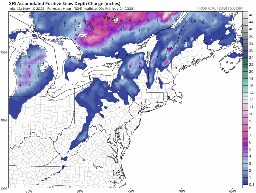 We can also take a closer look at the snowfall maps for the Northeast from the GFS over the same 6 day period, each showing what was modeled for snow depth changes (accumulating snowfall) through the following Friday.
