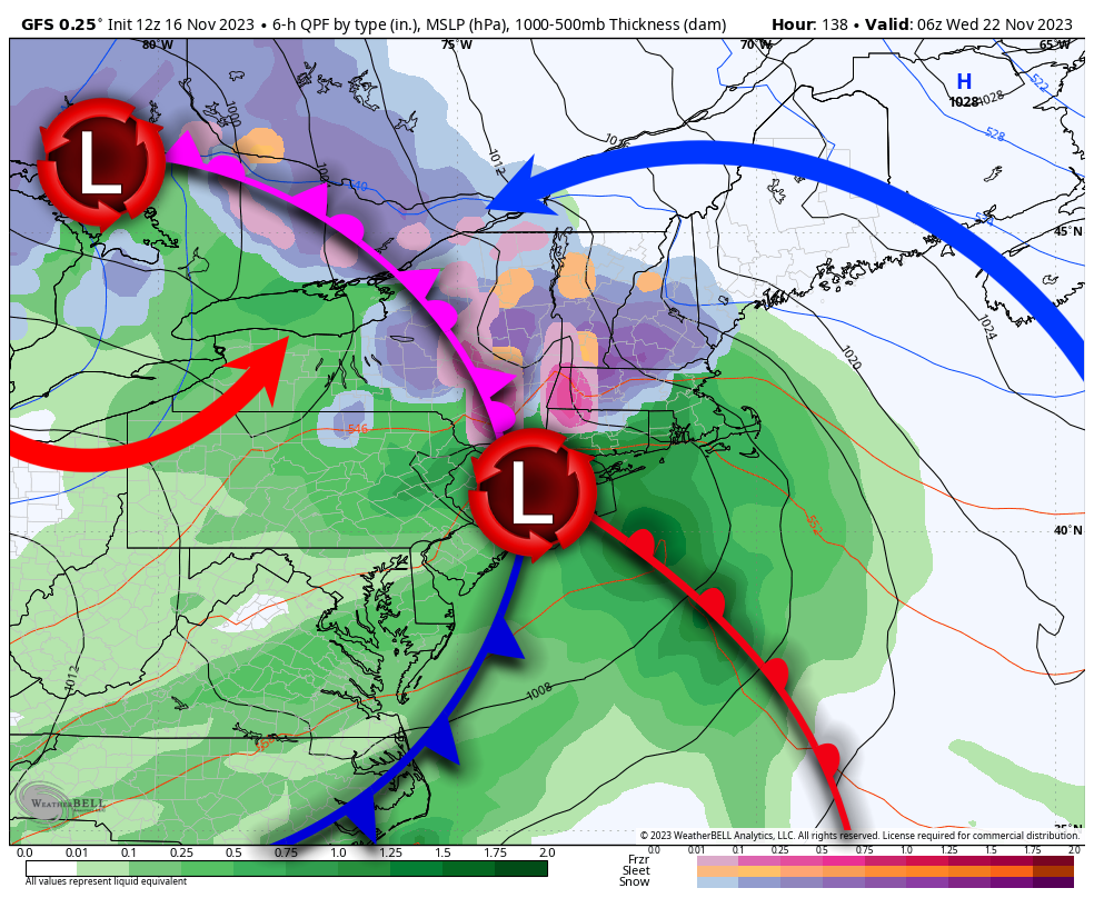 The type of storm models are expecting is a "Triple Point Low" which can occur in the Northeast when a mature storm cuts through the Great Lakes and forms a new low off the coast with precipitation spanning between the two systems. This can also help keep cold air from being overrun by warm air being pushed north by the inland low. Typically this means some areas stay all snow, mostly north of the Albany, NY latitude in such storms, with snow changing to rain as you move south, and an elevation dependent storm nearer the changeover line.