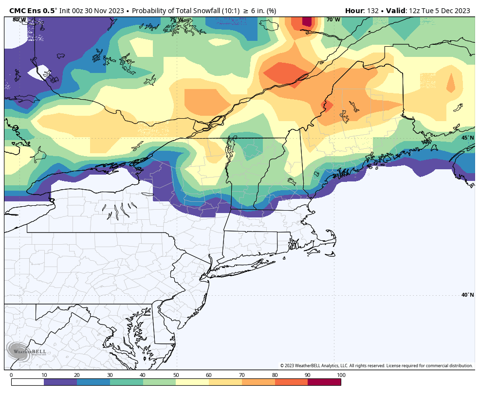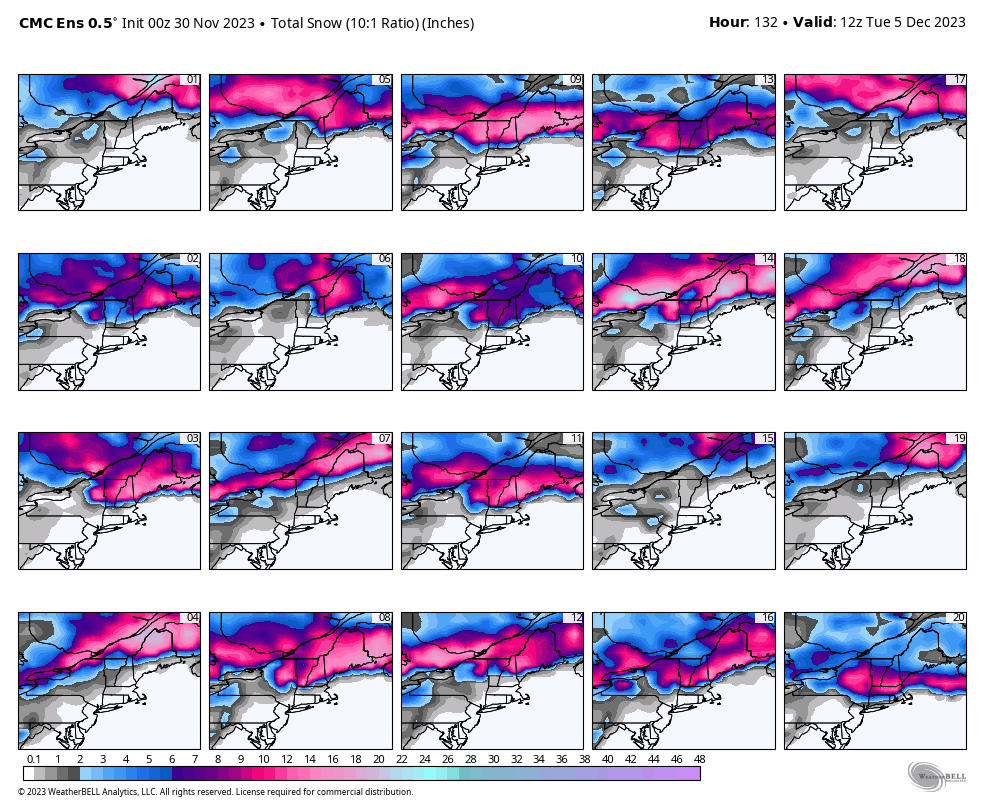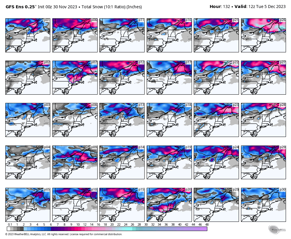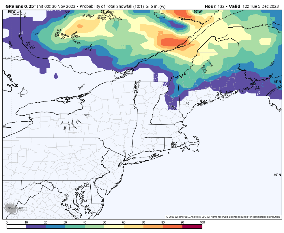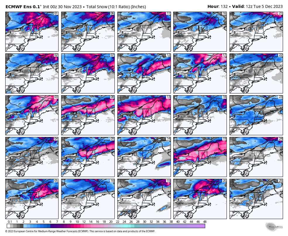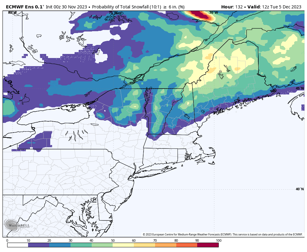 What the ECMWF sees is a much stronger low forming around Missouri and then making a jump to the coast to merge energy and moisture with the more southerly shortwave allowing the storm to amplify more and giving it a ton of moisture to work with. All of the other models show the boundary shortwave too far from the Atlantic to make that jump. Here's what the first 25 ensemble members show for snowfall and also the probabilities of +6" of snow. Strangely the oz deterministic run of the ECMWF shows snow in the Catskills and Berkshires which has little support in the ensembles and that is yet another indicator that a big storm is unlikely. The ensembles however show the more northerly focused storm has plenty of support and that would probably look similar to the GEM if so.