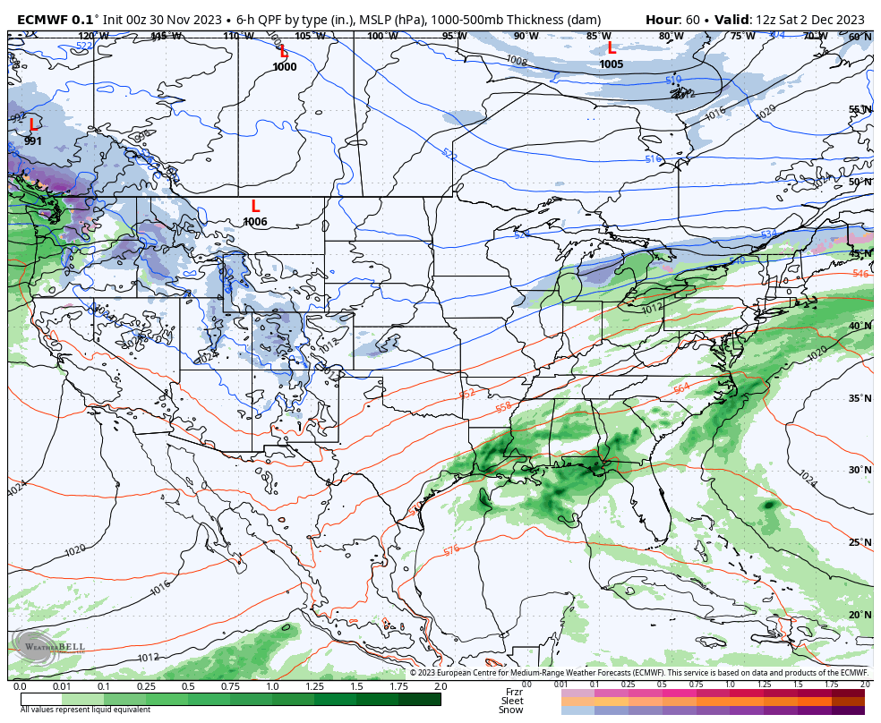 The GFS is the only deterministic model that favors a somewhat strong low forming and traveling along the boundary, and that produces the warmest result of all since the storm would push the boundary north ahead of the storm with southerly flow. This also would result in separation of the energy traveling along the boundary as well as near the coast. This is the wettest solution for Sunday, and the least snow modeled of the three. While I consider this to be pretty unlikely, the GFS is generally well skilled at this range.