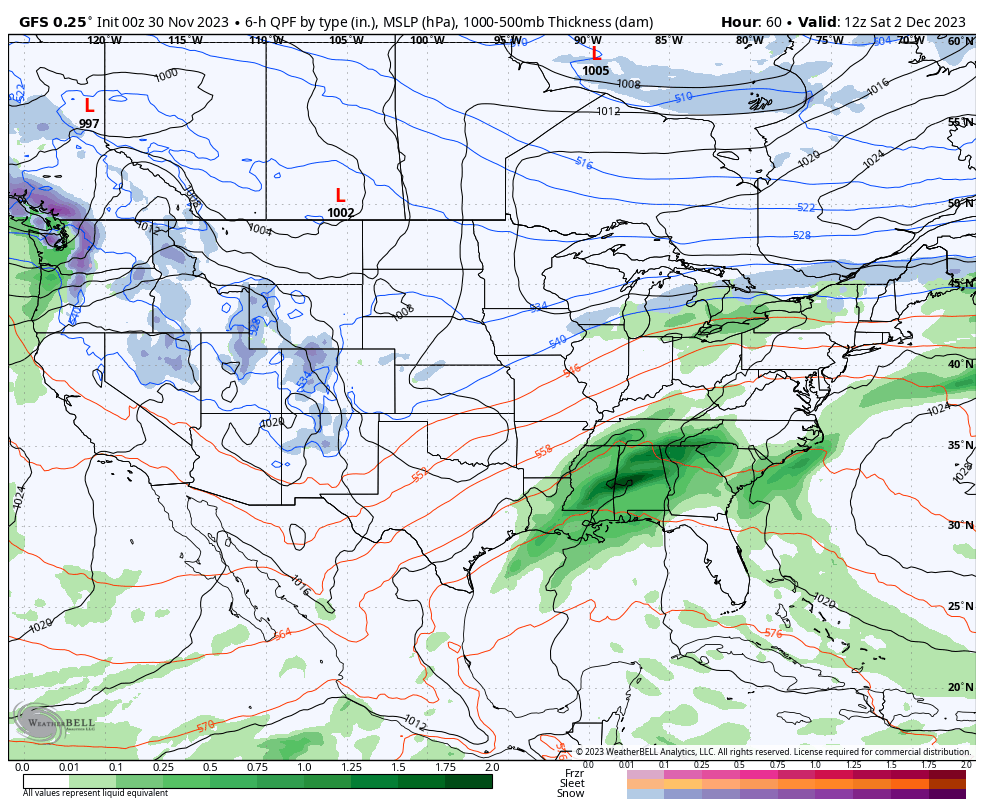 Come Friday the cold air will lift out of the Northeast and a boundary will park itself along the Canadian border with multiple weak shortwaves traveling along it on Friday and Saturday which will bring both rain and snow. That boundary is at approximately the location of the color shift from reds to blues in this thickness map which essentially measures the density of the air in the lower ~20,000 feet of the atmosphere. Colder air is of course more dense, and the 540 mb level on this thickness map is the approximate demarcation between where rain or snow will fall at sea level, and the jet stream is typically just south of this boundary.