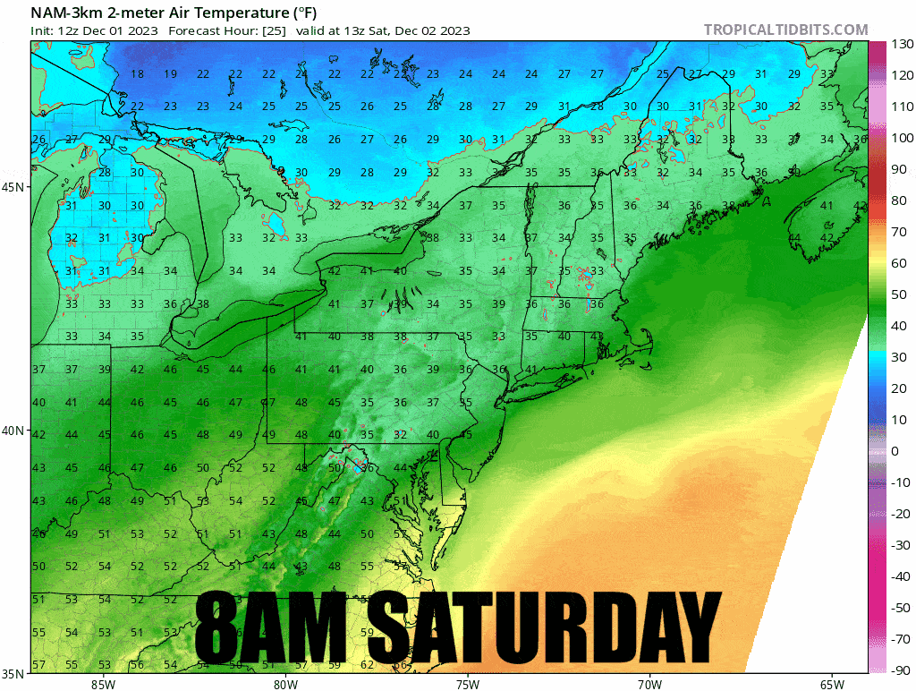 North of the Albany, NY latitude flash freezes overnight are likely, but this is also where snow in the PM is most likely. South of Albany we are likely to see rain by open.