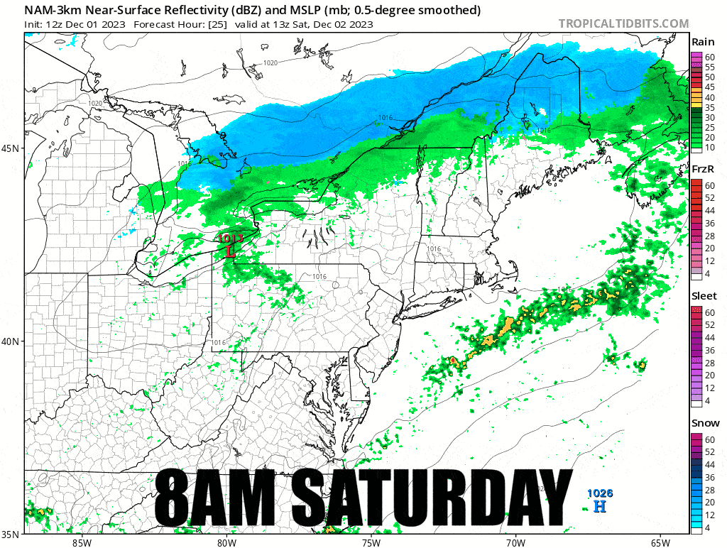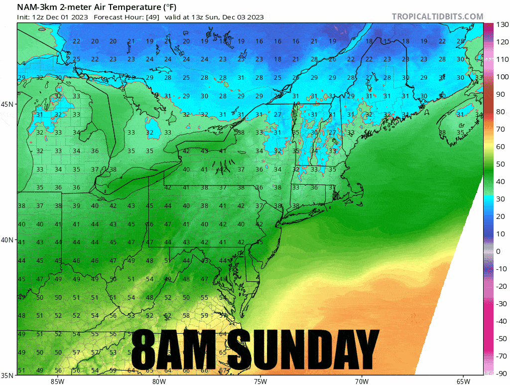 Due to strong disagreement on timing, temperatures, and types of precipitation, Sunday's forecast may not be highly accurate. I am certain however that there is a storm incoming starting Sunday that will likely bring snow to N-NY and Northern New England and rain elsewhere. I'm going to base my forecast primarily on the NAM3K for Sunday's forecast at this time. While this model is still adjusting, it seems to have a reasonable solution to the storm.