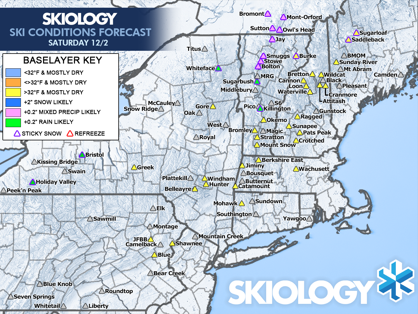 Saturday's two concerns are light rain near the Canadian border and sticky snow. When you get over a foot of fresh pow that then warms above freezing and gets rained on without dropping below freezing, that snow is highly likely to become extremely sticky. There are going to be a lot of people traveling to Northern Vermont looking for a pow party and getting stopped in their tracks. My concerns are in Vermont from Killington and north, plus Holiday Valley, Bristol, Whiteface, Saddleback, and Sugarloaf. Sticky snow is definitely possible at other places which netted 6" of snow starting Monday, especially on the flats.