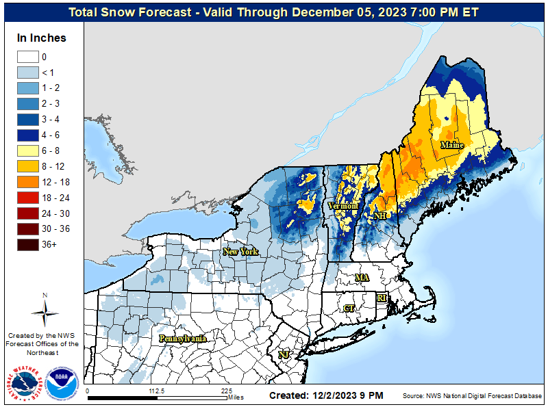 Here's a look at the NWS regional snowfall forecast through Wednesday morning. They trimmed in most cases, though NWS Burlington has now fully forecasted the trail end of the storm. My forecast overall is more slightly more bullish, but see places like Jay Peak, Smuggs, Stowe, Wildcat, Saddleback, and Sugarloaf likely reaching closer to 18" than 12".