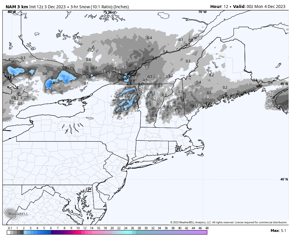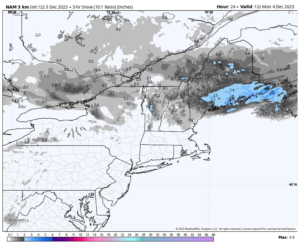 I'm showing three different 3-hour snowfall maps from today's 12z NAM3K to help you understand the driving challenges. The first shows snowfall 4PM-7PM on Sunday, the second shows 4AM-7AM on Monday, and the third shows 4PM-7PM Monday. These are all of the primary travel windows.