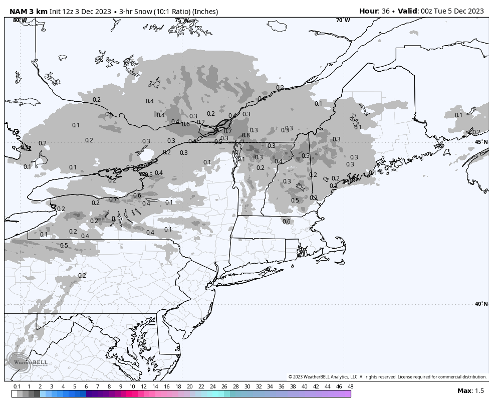 Here's a look at the temps from today at 8AM through Tuesday at 8AM. Pay close attention to how marginal temperatures are in Vermont through Monday. It can snow above freezing after the initial burst, but temperatures could affect snow ratios if they get too warm.