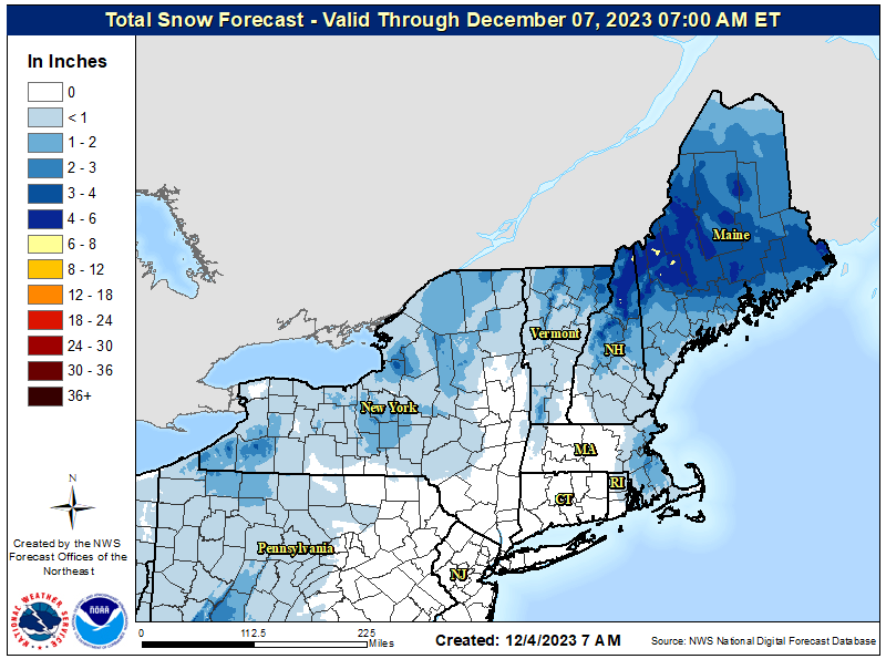 NWS also has their forecast from 7AM forward, but they are a bit more reserved than I am by about 1"-3" in general from around the Mount Snow latitude and north.