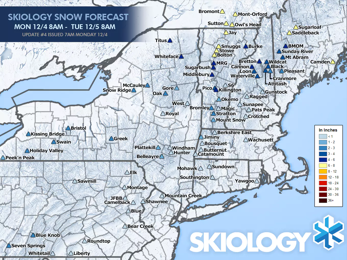 Our snowfall forecast is doing excellently with the mixing occurring up to about Gore in NY, south of Okemo in VT, south of Waterville Valley in NH, and no real mixing at Maine ski areas. Honestly, my forecast on this storm was about as good as I could hope for in every aspect. Some reports may be a little high and low of course and there is more to come mostly from the Killington latitude and north, though today will be spotty in some areas with things picking back up after close and through early Tuesday.
