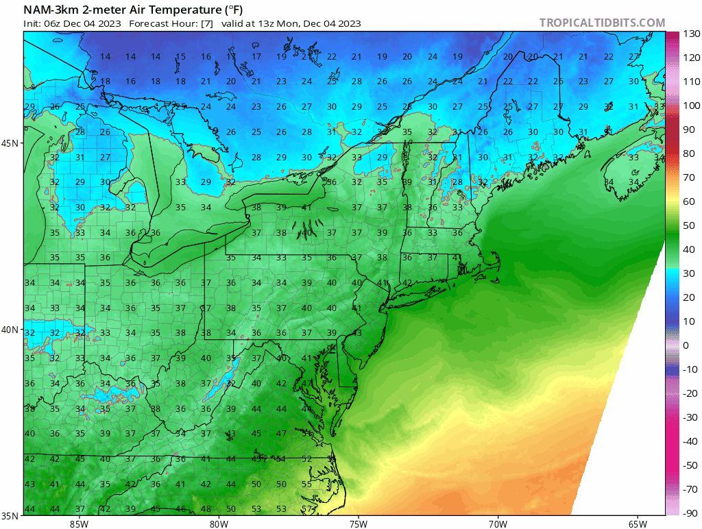 We pulled off another miracle with snow falling at or above freezing in many parts. Today we're going to see many ski areas in New York and Vermont get above freezing which means manky snow in those areas. Temperatures are more accommodating to fluff in Northern New Hampshire and Maine where the snow is plentiful. The following loop runs from 8AM today through 8AM on Tuesday.