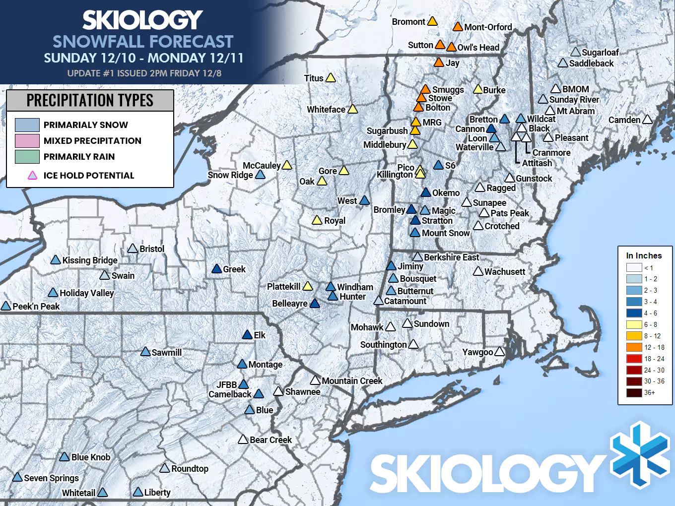 Most of the snow falls before close on Monday, but there's a good chance of enough snow falling after close to make Tuesday a powder day also. I will update the forecast once a day through Sunday. We will likely see some shifts.