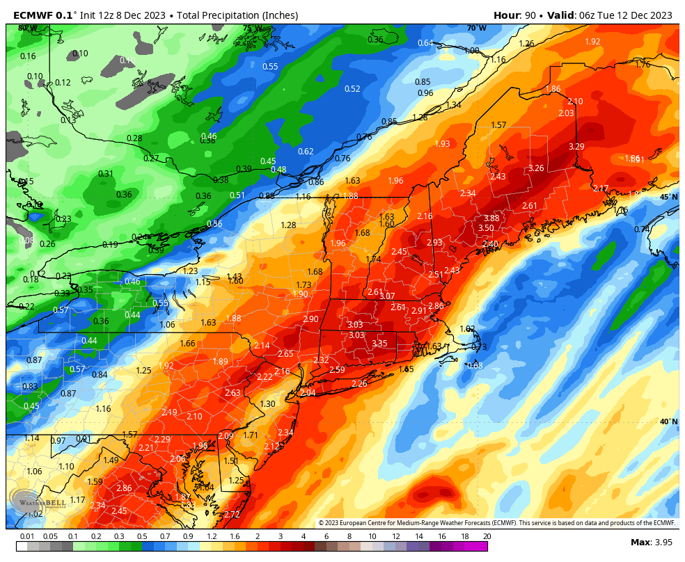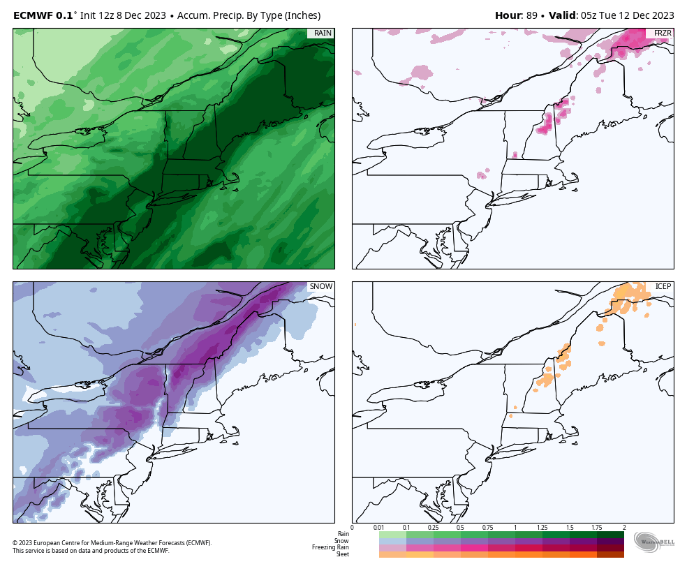 There is a broad swath of 2"-4" of rain that will stretch from E-PA through ME. This is going to cause significant damage to even snowmaking terrain at ski areas and possibly some flooding and runoff issues. I'm especially worried about Southern New England, NH, and ME. Let's start off with a precipitation by type, and I think you can spot where the rain quickly changes to snow, and where it doesn't.