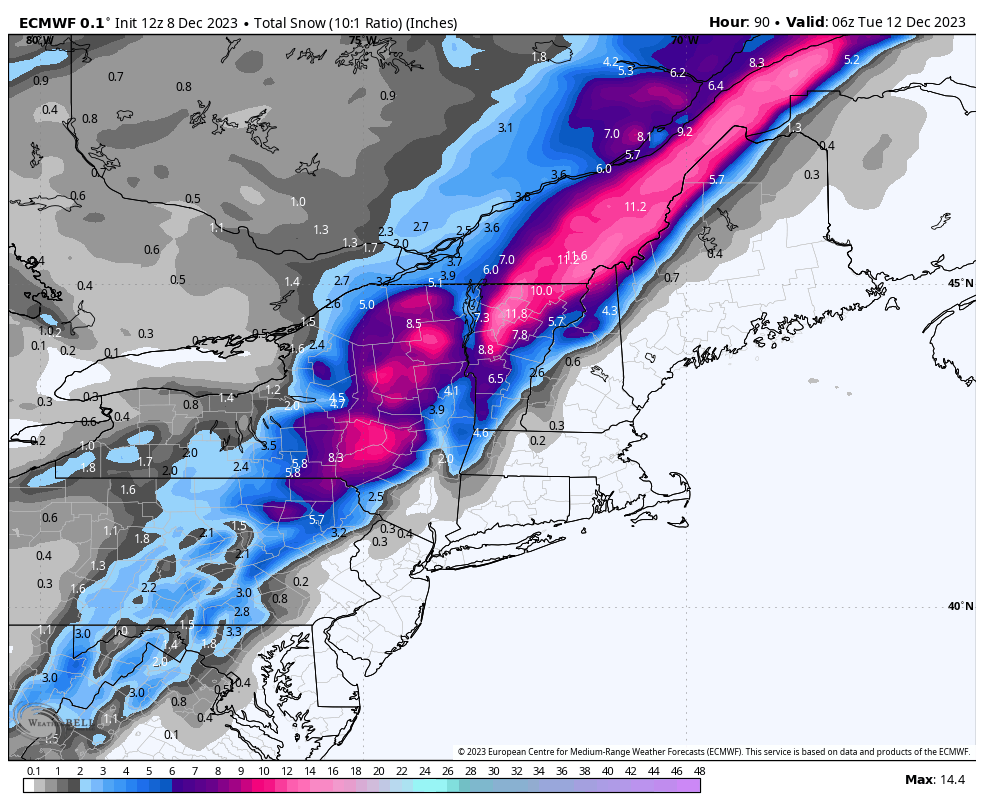 While there is pretty good confidence about the focus area, the edges are an open question, and clearly the amount of snow is also. It all depends on the strength of that low. So I'm definitely less confident about what happens in PA, as well as most of NY, especially the Catskills, and there are open questions in N-NH, and N-ME, though don't get your hopes up.