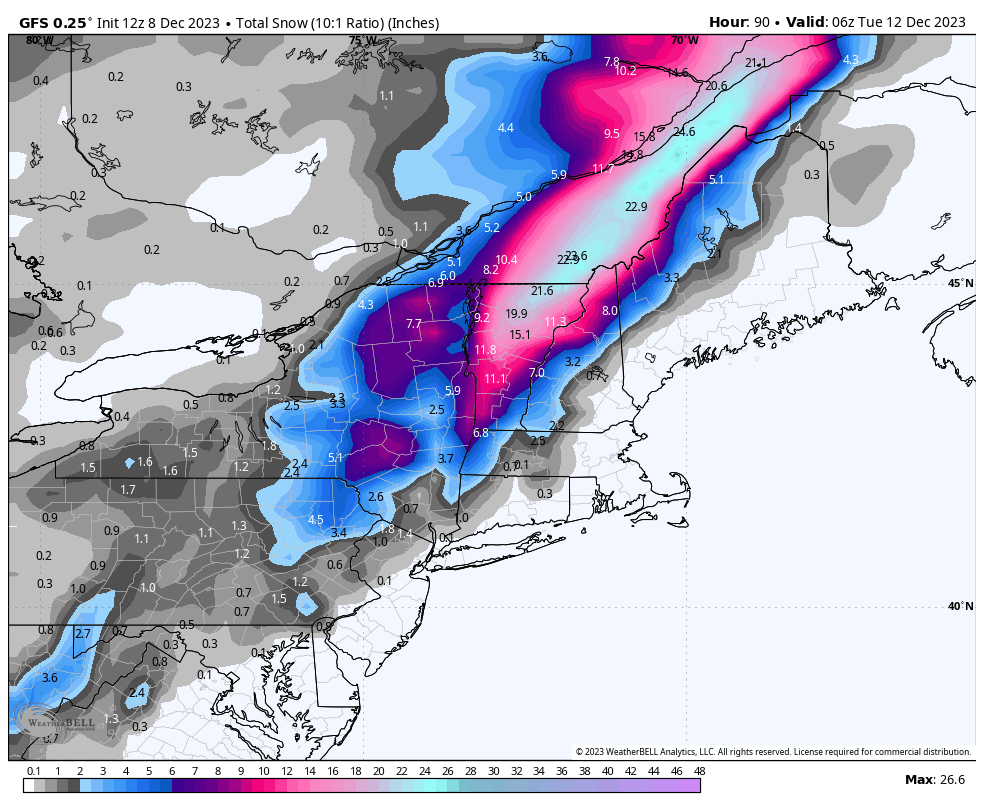 Which brings us to our first snowfall map for the storm. I'm being rightfully conservative at this time, especially considering that the snow should be very fluffy where it piles high, though this has a reasonably good chance of confirming. I would put the downside for the sweet spot not much further below what I'm forecasting, but you could add 50% to many of these totals if the storm does in fact bomb out starting near NYC. Keep in mind that everyone starts as rain in this storm, but not everyone flips to snow.