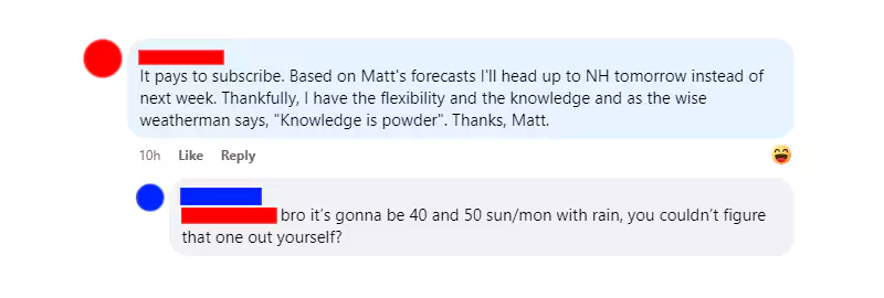 Hey first guy, thanks for the shout-out and the positive attitude. Enjoy your packed pow! Hey second guy who laughed at the first guy, guess what 'bro', we're likely getting a snowstorm for at least part of the Northeast, and the first guy is going to know where it is likely to snow before the second guy will because the second guy isn't a subscriber and thinks weather apps are going to show him the way. It's probably not going to rain on Sunday in New England for at least most of the ski day...bro. There may be wind holds on both Sunday and Monday and for the life of me I can't find wind hold forecasts on weather.com or even at the NWS. That probably has something to do with wind holds not being "weather". Those resources also won't tell you about when the snow will get sticky, but I do, and that's why first guy is out skiing right now.