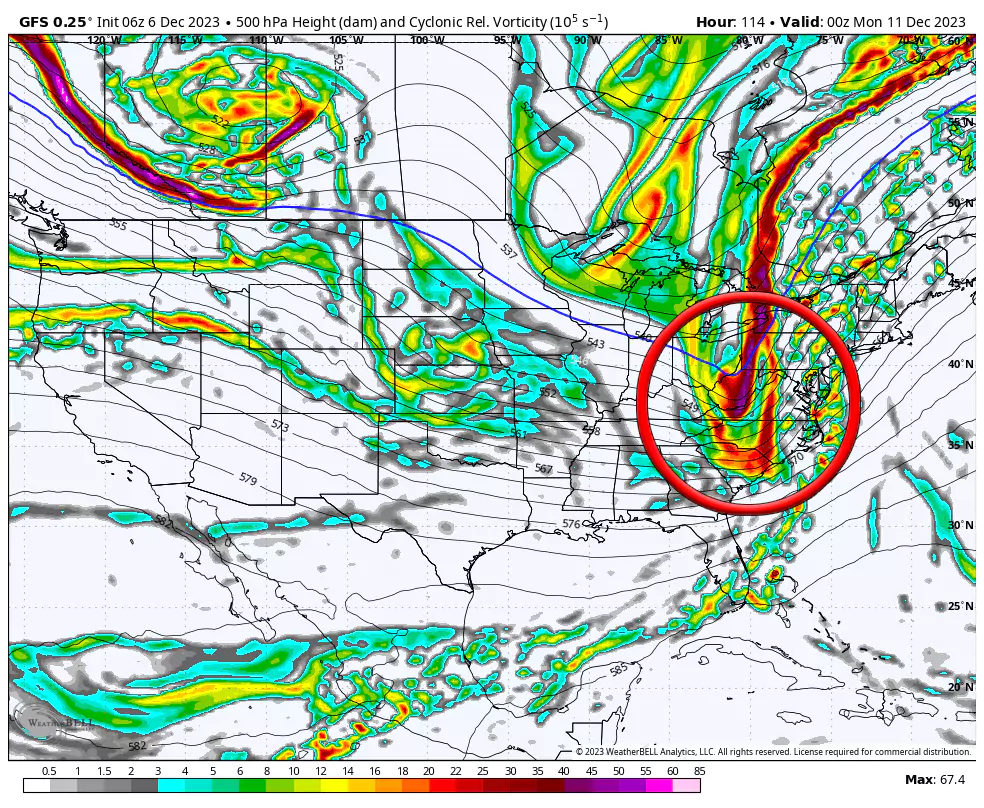 And then there is this. We have a deep sharp trough reaching the Southeast and that trough is going to tilt negative (boom time for storms to form) in a sweet spot for nor'easters to be born, and the only reason why models don't see a nor'easter is because the storm forming along the low level jet early Sunday will be too close and strong. There's so much energy on this vorticity map and there's an outside shot that things could shift into nor'easter territory with just some minor changes in timing and location.