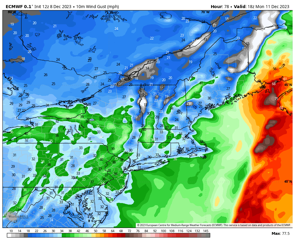 Monday may be pretty damn hard to hunt due to the wind, so delaying until Tuesday may be the right call. Wind will become westerly behind the cold front and blow hard across the entire region. Let's take a look at some wind gust speeds in lower resolution.