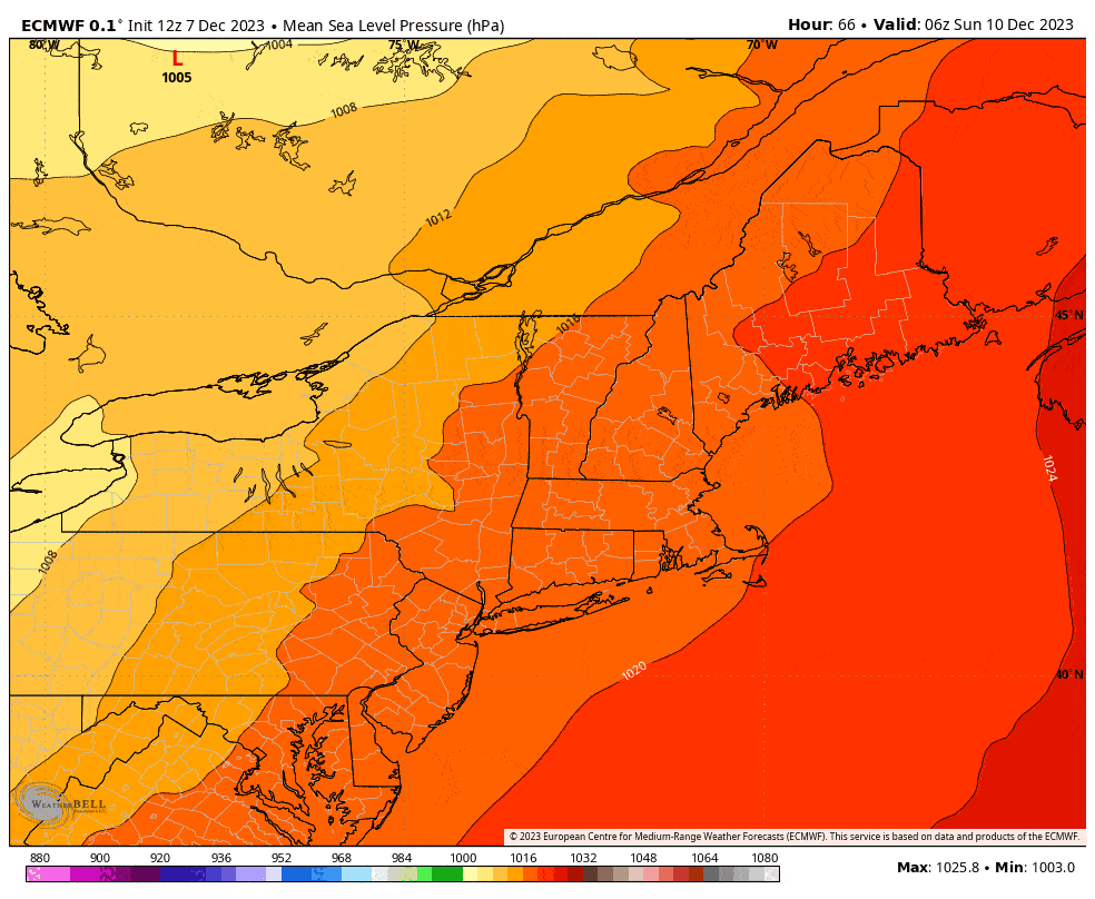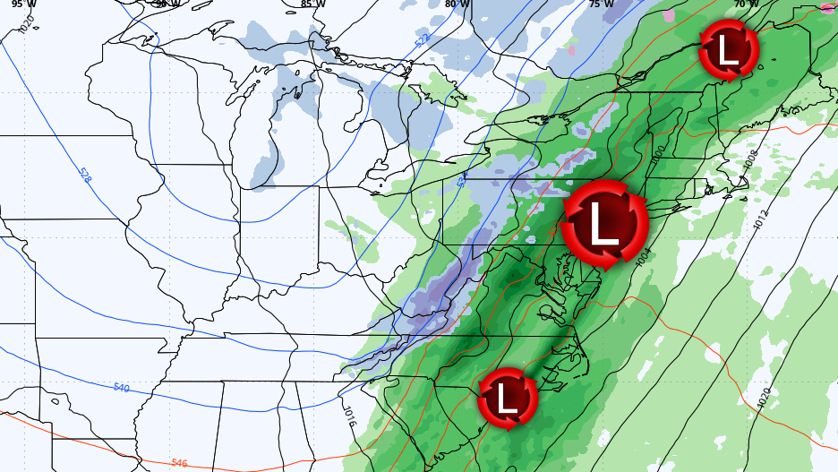 The surface pressure map shows which of those lows spins up stronger. When one of the lows becomes stronger, generally highlighted in green in the second loop, that's when more moisture gets thrown behind the cold front and falls as snow. While models are in good rough agreement on this currently, ensembles show enough variability to matter. It seems the low really wants to feed off the ocean near NYC around midnight Monday morning, which is an attractive spot, so that's why this is the leading solution and plausible.