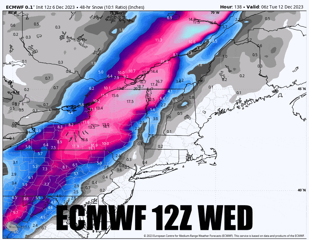 Let's however look at three different runs of the ECMWF over the last 24 hours to demonstrate the variability in snow based on the strength of the low. It's notable, and this is why confidence is only average at best right now.