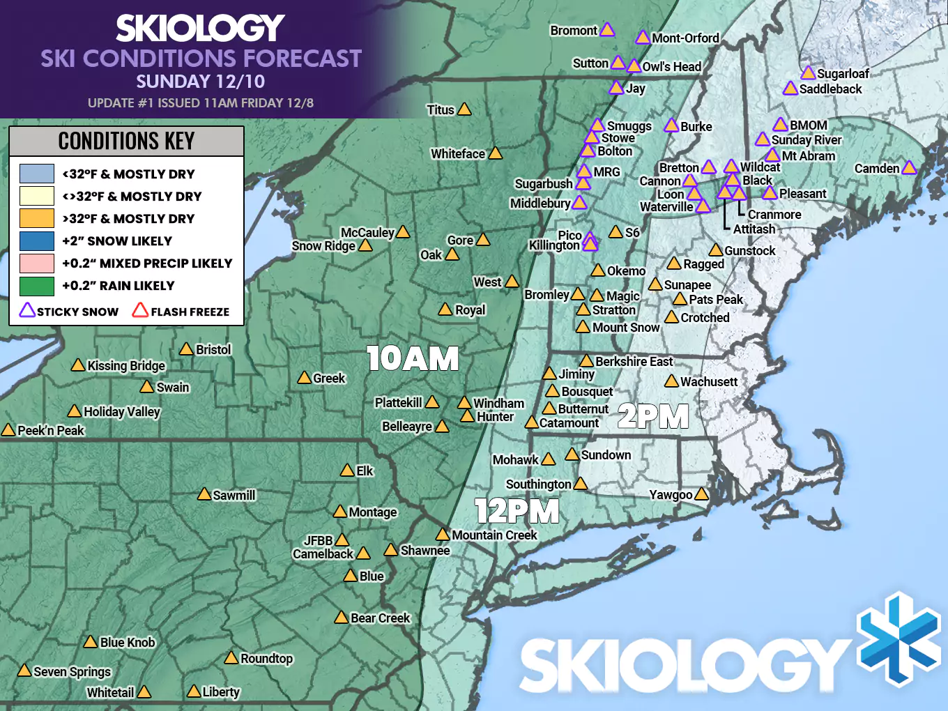 We'll dive right into the new Ski Conditions Forecast map for Sunday, but this time there is a baselayer which indicates when the rain will start. I've chosen today's 6z ECWMF for timing, and it is faster than some other models, so I would expect the arrival time to generally not be faster than shown, and they may be up to 2 hours later. No one is going to refreeze overnight and that means whoever was sticky on Saturday will likely be sticky again, but Saddleback and Sugarloaf are being added to the list as this will be their first thaw. It will likely be worse overall than Saturday in that regard. We also have wind to deal with and I'll discuss that separately.