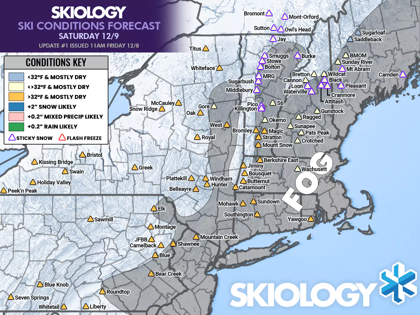 Let's start out with the good stuff. It will be spring-like and comfortable for many to ski this Saturday if you pick 'em right, and I'll certainly give you all a heads up for what I am expecting. Terrain is building all over and we have a respectable amount of terrain now as well as more and more ski areas opening. For many, Saturday will be the best day for probably a couple of weeks, so make it happen! Here's the new and improved Ski Conditions Forecast for Saturday with the addition of a fog layer, and I'll discuss the highlights below.