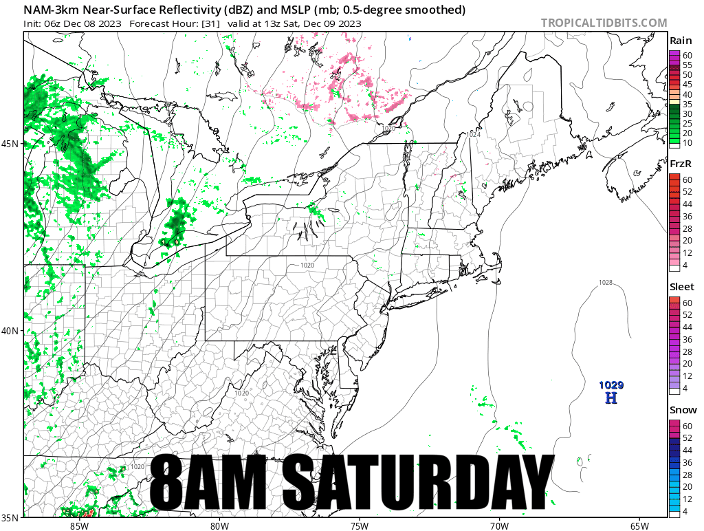 Although Saturday shouldn't be rainy, there is a heap of moisture flowing north with the southerlies out in front of this storm and that's going to create fog and even mist on the mountains, possibly even some freezing mist in parts of Maine. Let's take a quick look at the NAM3K simulated radar for Saturday, and pay close attention to those little green and pink specks. When you see that in this particular version of the NAM3K, that generally means fog and mist on the mountains. There's also going to be a ton of fog on the coastal plain through the entire Northeast. This might cause travel issues Saturday morning as well as ski issues when it comes to visibility.