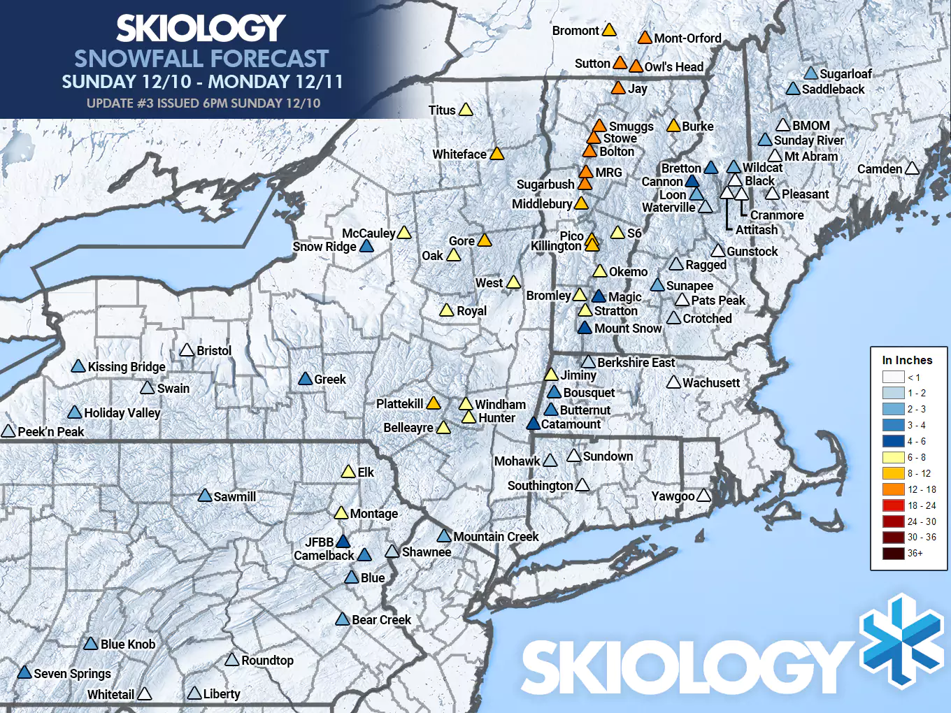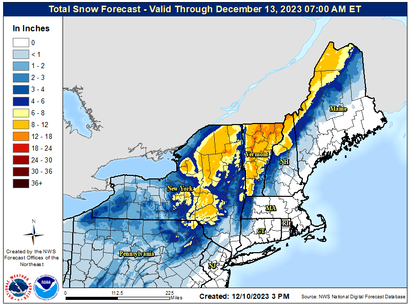 NWS offices finally bumped a notable amount today all over VT, NY, and PA, coming more inline with Snowology's forecast which bumped yesterday evening and then trimmed a little today due to the faster storm. This is a notable change from the NWS in the last 24 hours.