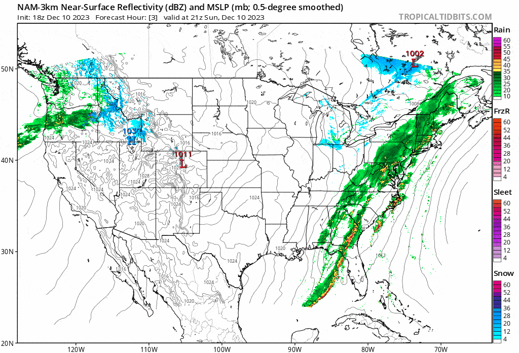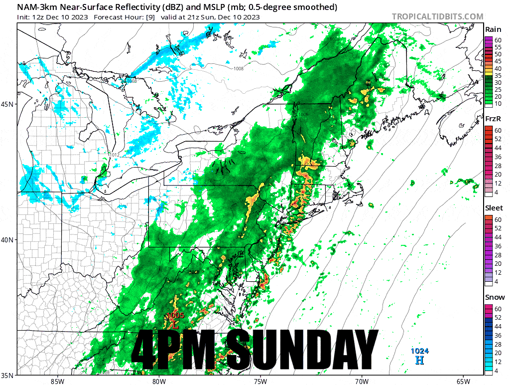 I'll start this time with a timestamped simulated radar map from the NAM3K showing 4PM today through the end of Monday.