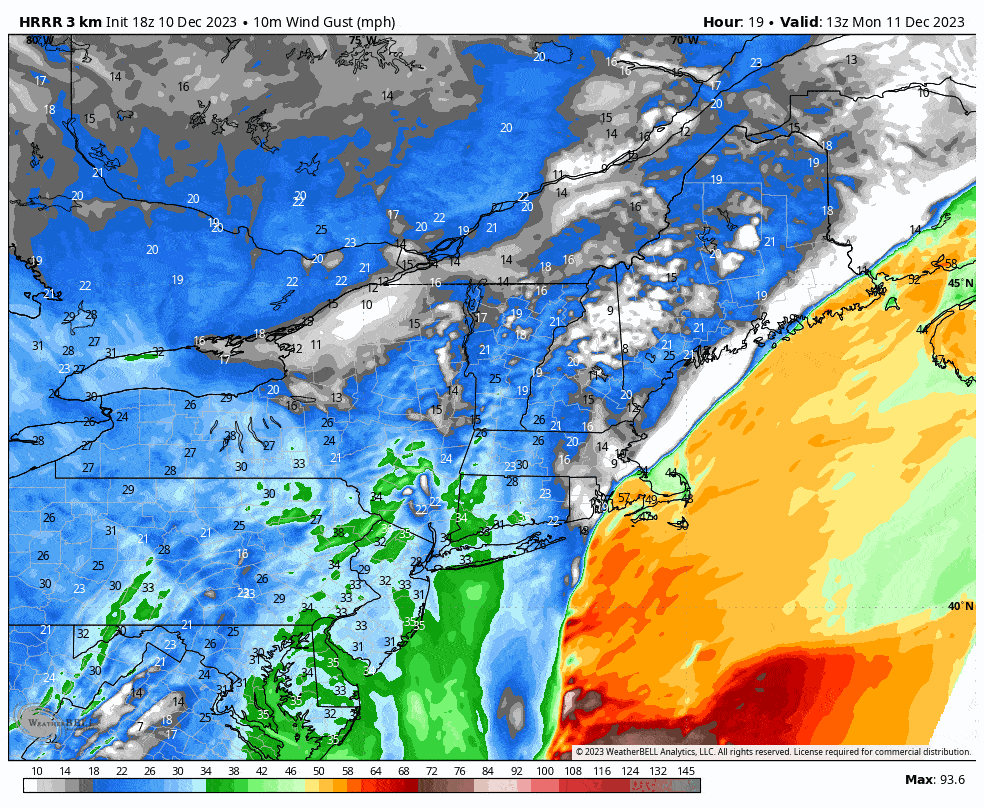 Here's an hourly map of the gusts, but note, our Wind Hold forecasts are not simply wind speeds, not by a longshot.