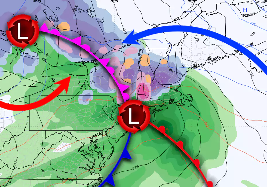 This storm is likely going to be a cutter with a strong inland low passing over the Great Lakes, but it has been drifting east slightly in the models and taking on a more mature T-bone like shape which has given rise to the possibility of triple point low where a secondary low forms off the coast and helps keep the cold air locked into parts of the region. I created the following graphic for a storm in November showing how the secondary coastal low feeds cold air in between the two circulations and helps keep the push of warm air at bay. You need a coastal low that is strong enough to resist the warm air push from the stronger primary inland low. You also need a more mature storm for this to occur.