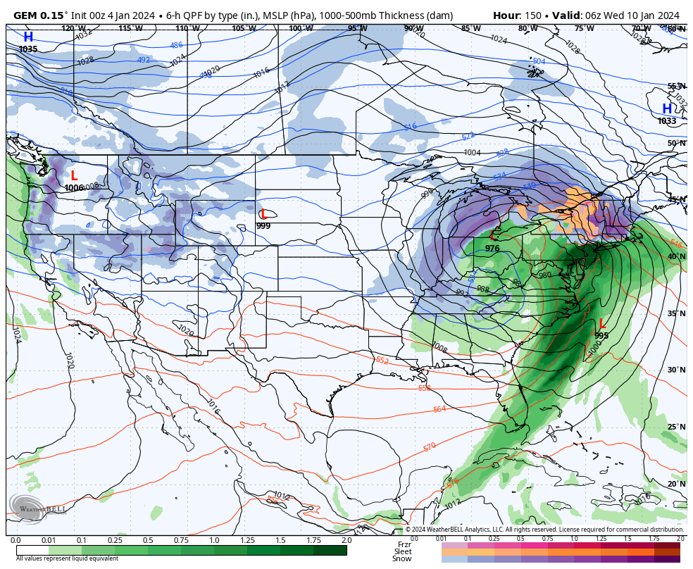 If that inland low is too strong, it won't allow the coastal secondary low to lock in the cold. The ECMWF sees the inland low reach 964 mb, which is crazy strong (lower pressures mean stronger storms). That's technically possible, but highly unlikely. The GFS on the other hand sees that inland low only reach a minimum of 984 mb, which is very strong, but not unreasonably so, and as a result that model not only sees the cold locked in to keep broad areas all snow, the coastal low also takes over and sees and energy transfers from the inland low. That's probably the best result we can hope for with this track, and while some get mostly rain, most do not. The GEM model is currently about half-way between the other two and would mean a change to some rain expect for the Whites and Longfellows (N-NH and N-ME) which is a typical sort of triple point low result.