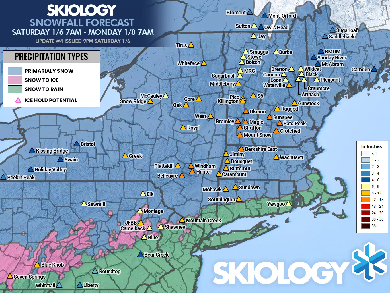 I forecasted snowfall for over 80 ski areas in the Northeast and here's a list of what they reported as of about 4PM today. Please pay close attention to "Morning" and "Afternoon" identifiers, especially in Eastern New York and New England as the snow was ongoing after open today for these areas. Significant snowfall was seen after the morning in much of this area. Snow reporting by ski areas is also very inconsistent. I forecast for the upper 2/3 of terrain which is generally the standard, but some report from the base, even at mountains with over 2,000' of vertical and hardly any use NWS standards. Most actually under-report snow now and I don't feel like any of these reports were likely too high. After close today 1"-4" is also possible, mainly in Northern New England. Basically the reports from the afternoon will be accurate for each ski area's standards, or 1"-4" below what the final totals are likely to show Monday morning.