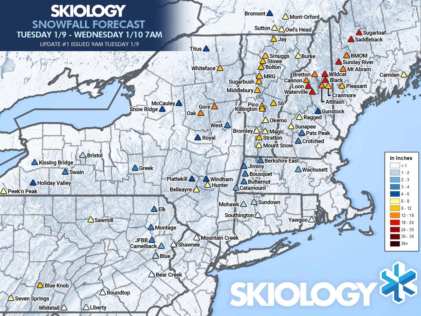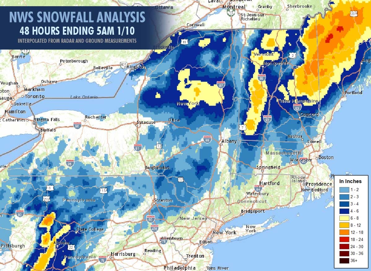 The NWS interpolated snowfall map was before the end of the snow in Northern New Hampshire and Northern Maine, and in many cases showed more than was reported and their interpolation typically comes up short of what ski areas report. For instance, I spotted about 6"-8" at Berkshire East prior to the switch, but NWS interpolation puts them at 3"-4" and there was a similar situation at Belleayre and this is widely what happens in every storm with this interpolation. Radar holes at Jay showed through as expected in the interpolation with a lack of nearby ground observers, though their 13" report is hard to quantify without drifting/snow catches being measured. Here's the final forecast from Snowology as well as my wind hold forecast, though I did indicate that there would be operational delays beyond the wind holds that would make this storm difficult to hunt, and it no doubt was.