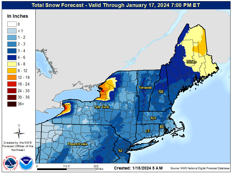 Much of this snow should be quite fluffy, especially more than 100 miles inland from the coast. Wind will be tame so there won't be a lot of upslope enhancement of the snow. This is what the NWS has for snowfall through Wednesday evening and I'm not going to split hairs over 2" here or there that may be spread across two ski days. Note the lake effect is still dumping and will through Sunday in varying directions while a big low in Canada keeps churning.