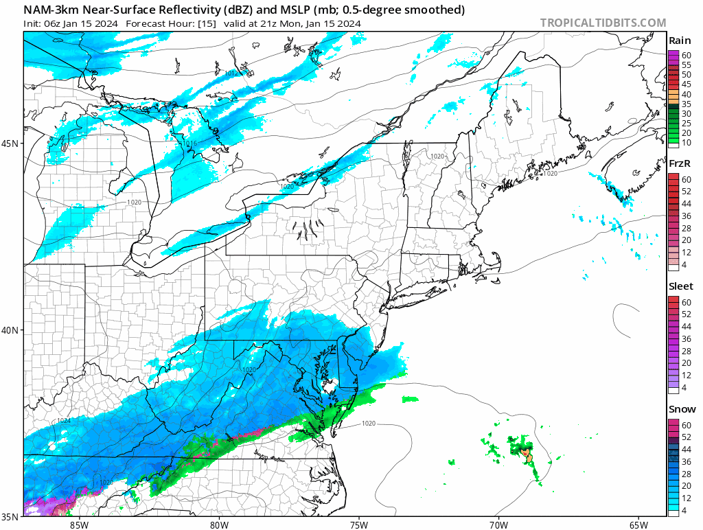 The snow will be running into dry air as it moves northeast today and around 4PM is when the snow should start crossing the southern PA border. By open on Tuesday snow will have reached about the Killington latitude while the enhancement from the second shortwave comes in from the west. That will pop the storm up a notch as it crosses Northern New England. At close on Tuesday the snow will primarily be in Eastern New York and New England and exiting the Northeast a little after midnight.