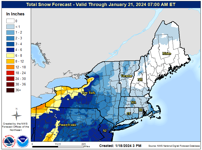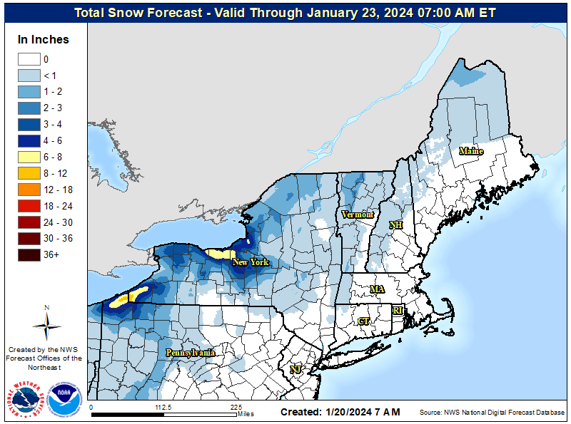 Between this morning and open on Sunday you can expect generally 1"-4" to have fallen in parts of N-VT and N-NY with the heaviest snow mostly pointing southeast off of Lake Erie with some lighter accumulations around Rochester into CNY. That lake effect snow could produce up to 8" more in the 24 hours between 8AM Saturday and 8AM Sunday. Here's what the NWS was forecasting after 7AM through the end of this event.