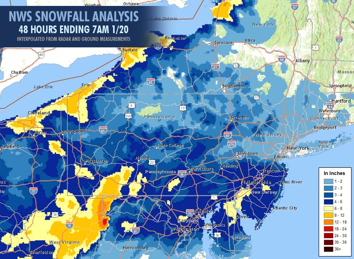 I took some time to gather up all of the snow reports in areas that were expected to receive 2" or more in parts of NY, PA, NJ, MD, and WV. Snowfall of 7" to 20" was reported across the Alleghenies. The list is sorted alphabetically and excludes those who didn't report a total for this entire event on their snow report.