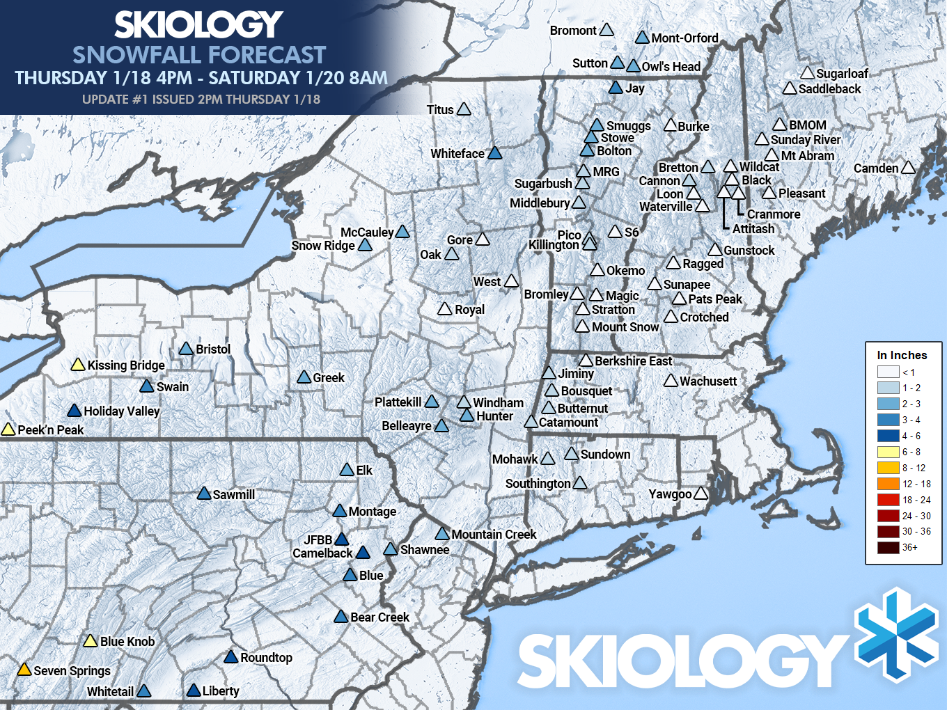 In the Tug Hill area of NY and also in Northern Vermont it was not possible to gather accurate snowfall for this period due to how snowfall is reported. Some only report the past day while others will include previous day totals in the last 2 day total. Those areas largely confirmed however, though this was a drop in the bucket compared to what had fallen in the previous week. Surprisingly, there are a number of ski areas in Pennsylvania who don't report snowfall on their websites despite snow being the biggest attractant for skiing, though when it snows in PA there is typically no shortage of skiers and riders. Strangely also, only Snowshoe and Timberline shared powder shots on social media.