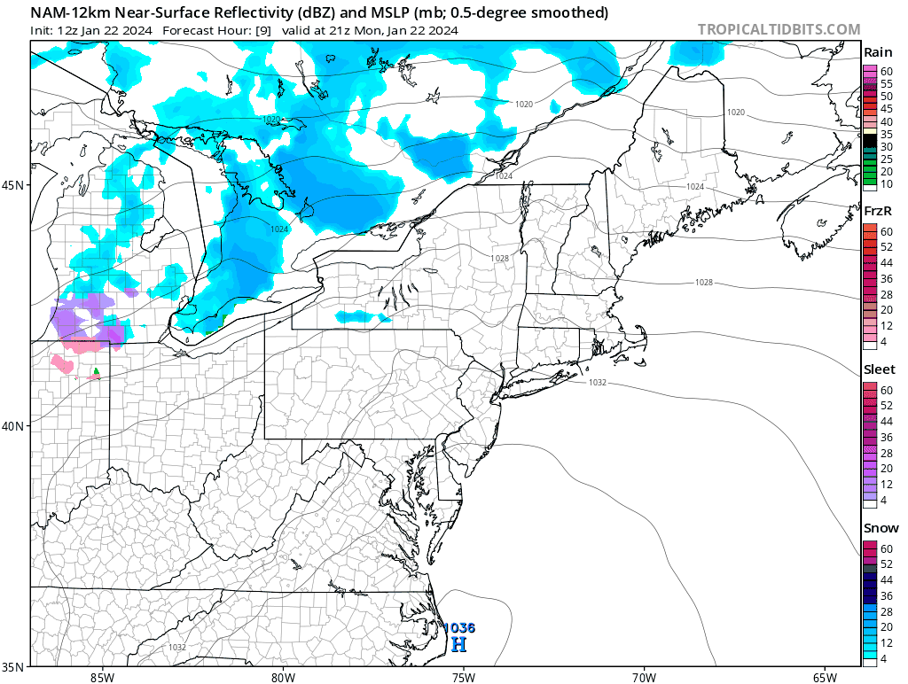 We have a 3 day battle between warm moist flow from the southwest and cold dry air from the northwest that will eventually result in the warm moist flow winning out. Over the three days we'll see as much as 1" of water fall as snow, freezing rain, and rain with a little sleet mixed in and lighter amounts as you move both north and east. Here's a loop of the NAM12K simulated radar covering 4PM Monday through 4PM on Thursday to start the coverage off.