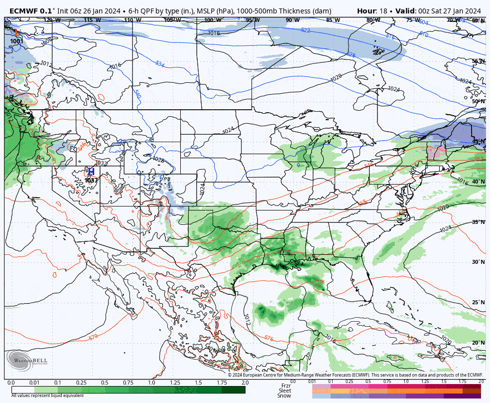 We have a pretty good sized storm coming starting late Saturday. It's an 'inside runner' that tracks up the western side of the Appalachians. When it reaches Ohio it will transfer energy to the coast somewhere near the Chesapeake Bay where the storm will continue to intensify and track south of New England towards the east-northeast. Snow will exit the Northeast sometime Monday afternoon. Let's start out with the broad view from the 6z ECMWF showing 7PM Friday through 7PM on Monday.