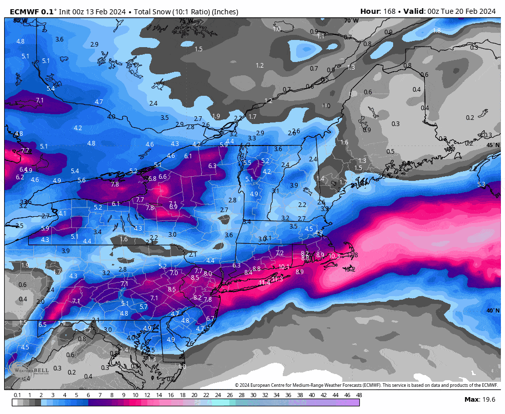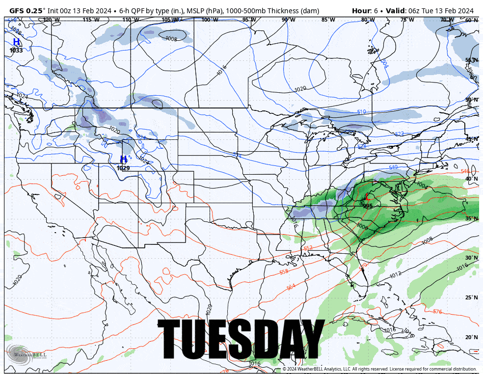 Quit your complaining folks, groundhogs have not yet invented weather modification devices nor do they own crystal balls, winter is far from over, just ask the folks in PA, NJ, CT, RI, and MA. Yeah sure today's storm didn't hit the big mountains up north, but they're literally starving for snow in the more southern areas and this is their time of year to shine. We are in an active weather pattern with northwest flow all week long and we have 5 systems, mostly smaller, coming at us in just 7 days. Let's start off with a loop of the GFS covering Tuesday through Monday.