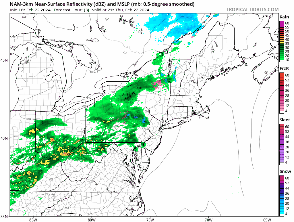 This storm seems to be weakening in recent model runs unfortunately so the maximum amount of snow will probably be closer to 4" from this system. People also keep texting me about Jay Peak claiming 10" is forecasted. No, it will be like 2"-3" I'm afraid, and maybe a little mixing to start tonight. I think they are going off of an old overly-optimistic forecast unfortunately. The storm is barely a storm and won't do much. Here's a loop covering 4PM today through 4PM Friday.