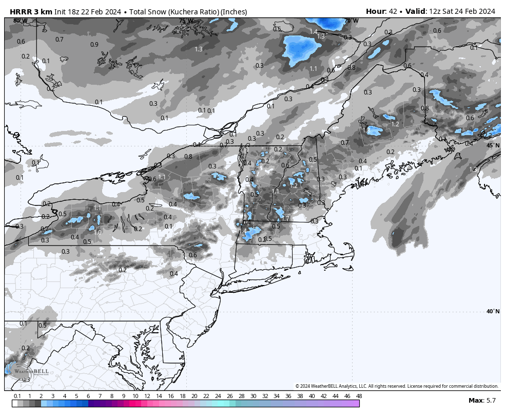 I don't manually forecast snowfall for minor storms, but I will choose models that I believe best represent what I feel will happen at ski areas. This is a downgrade from yesterday, but really only by about 2" as it wasn't looking like much to start with. This is the HRRR model showing kuchera ratios which in this case are lowering the accumulations slightly. 1"-4" is the widespread expectation for ski areas from the Catskills and north.