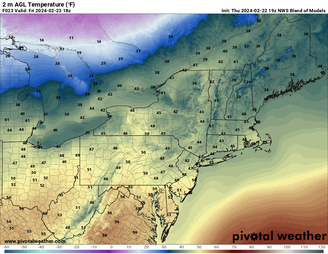 Friday things will also warm up a bit behind the storm with only parts of the Whites and Longfellows remaining below freezing. You will want to watch for sticky snow where snowfall was copious last weekend, that blower pow warmed up is some of the stickiest substances known to man once it reaches 35F. Here are the 1PM temps for Friday.