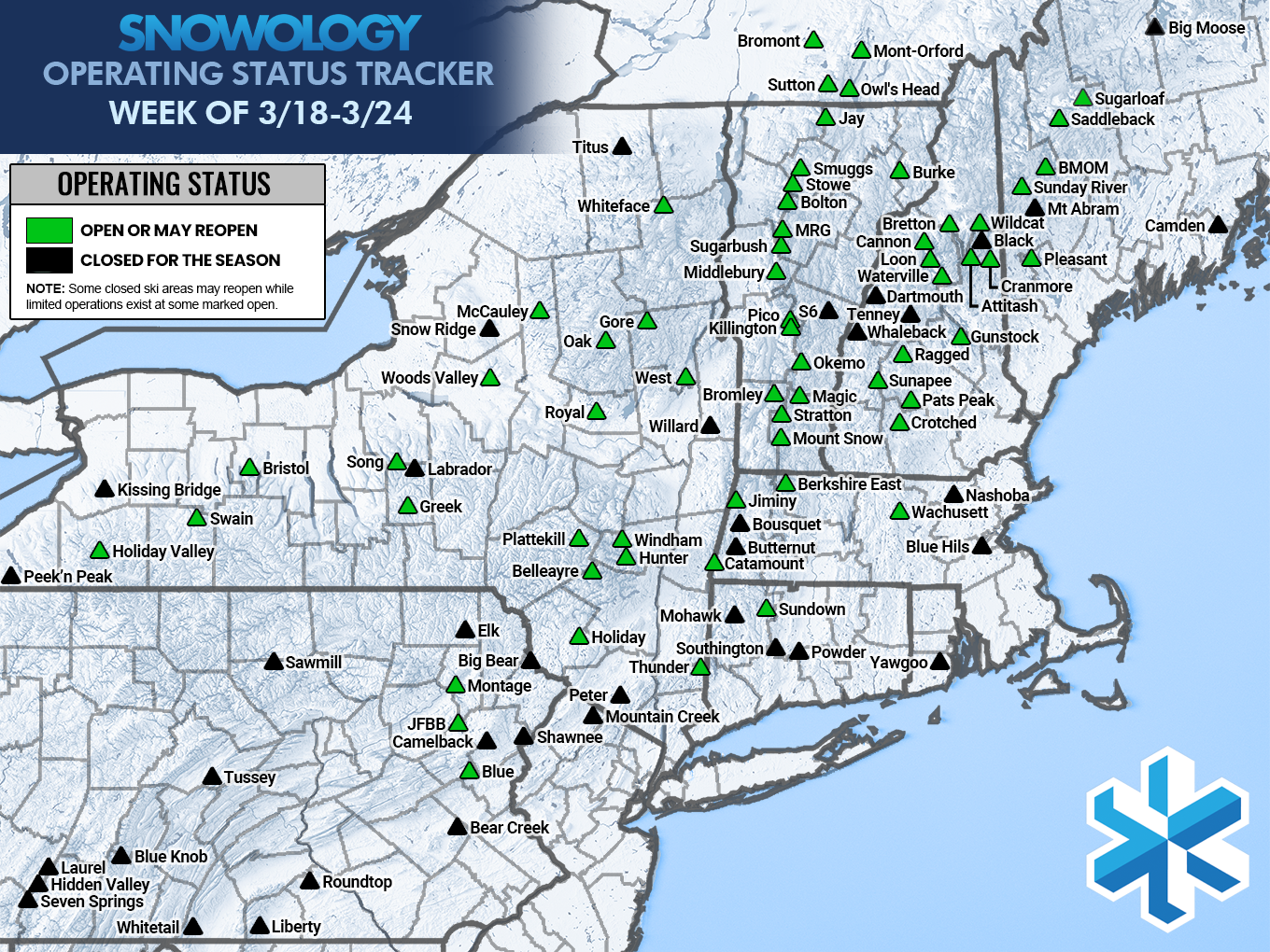 Let's start off this week with our Operating Status Tracker, but note, there are a good number of ski areas listed as open who will remain closed during at least part of the week and in some cases operations next weekend are only a definite maybe. Always check with the ski area in question before making plans!