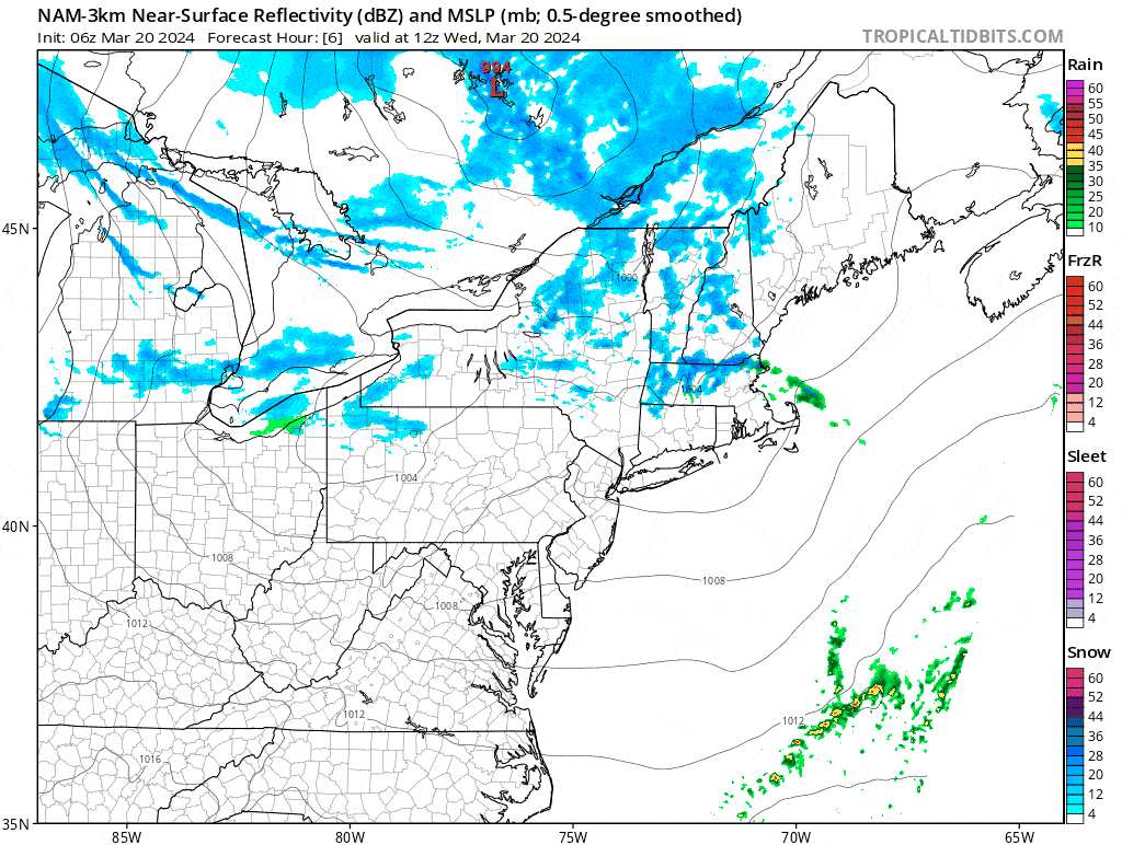 We had some model disagreement yesterday regarding the development of a coastal low with this storm and we now have strong agreement that a mesolow will form in NY, move across New England, and intensity and grow as it travels east. There is still some uncertainty as to when and if the storm will take a left turn to the north and that may matter for the snowfall in Maine. Here's the latest simulated radar covering 8AM this morning through 4PM on Thursday.