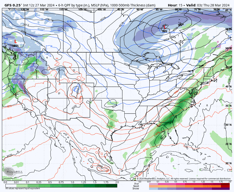 Let's start off with the broad view showing this storm in the GFS from Thursday through Saturday. Note, the deterministic GFS isn't fully on board and it has a warm bias that is more obvious when temps are so marginal so you won't see what is likely the full opportunity here.