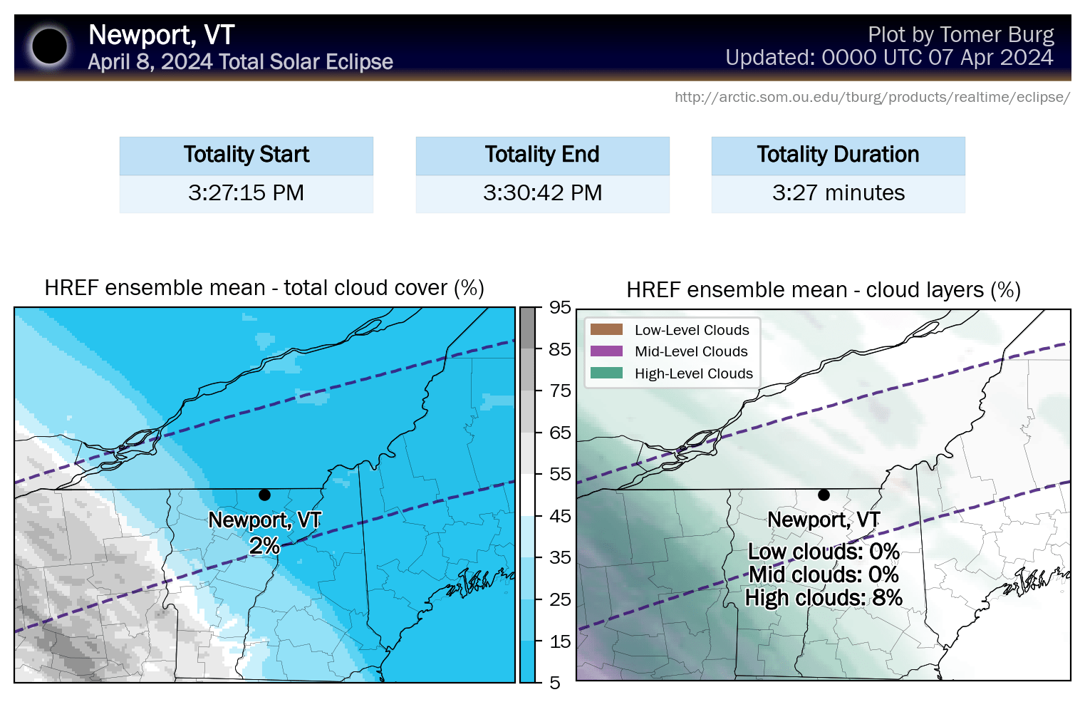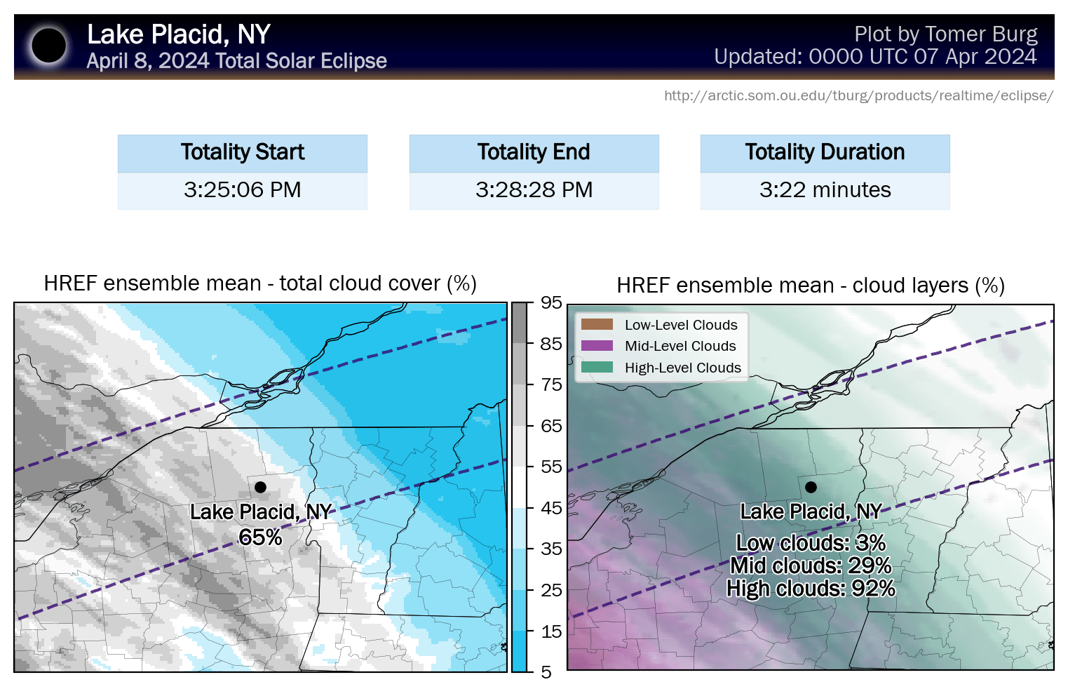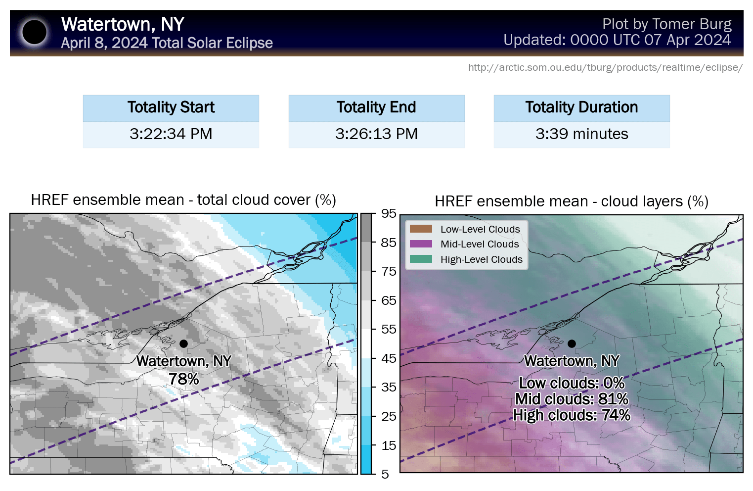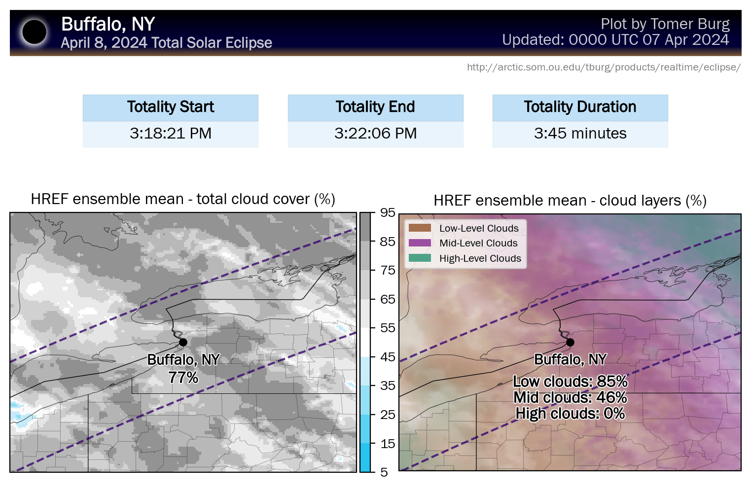 Tomer Burg has updated his maps to use mesoscale models now that they are within range. He has also created new maps from the HREF ensembles that differentiate low, middle, and high clouds as they have varying levels of effect, with high clouds being the least troublesome.