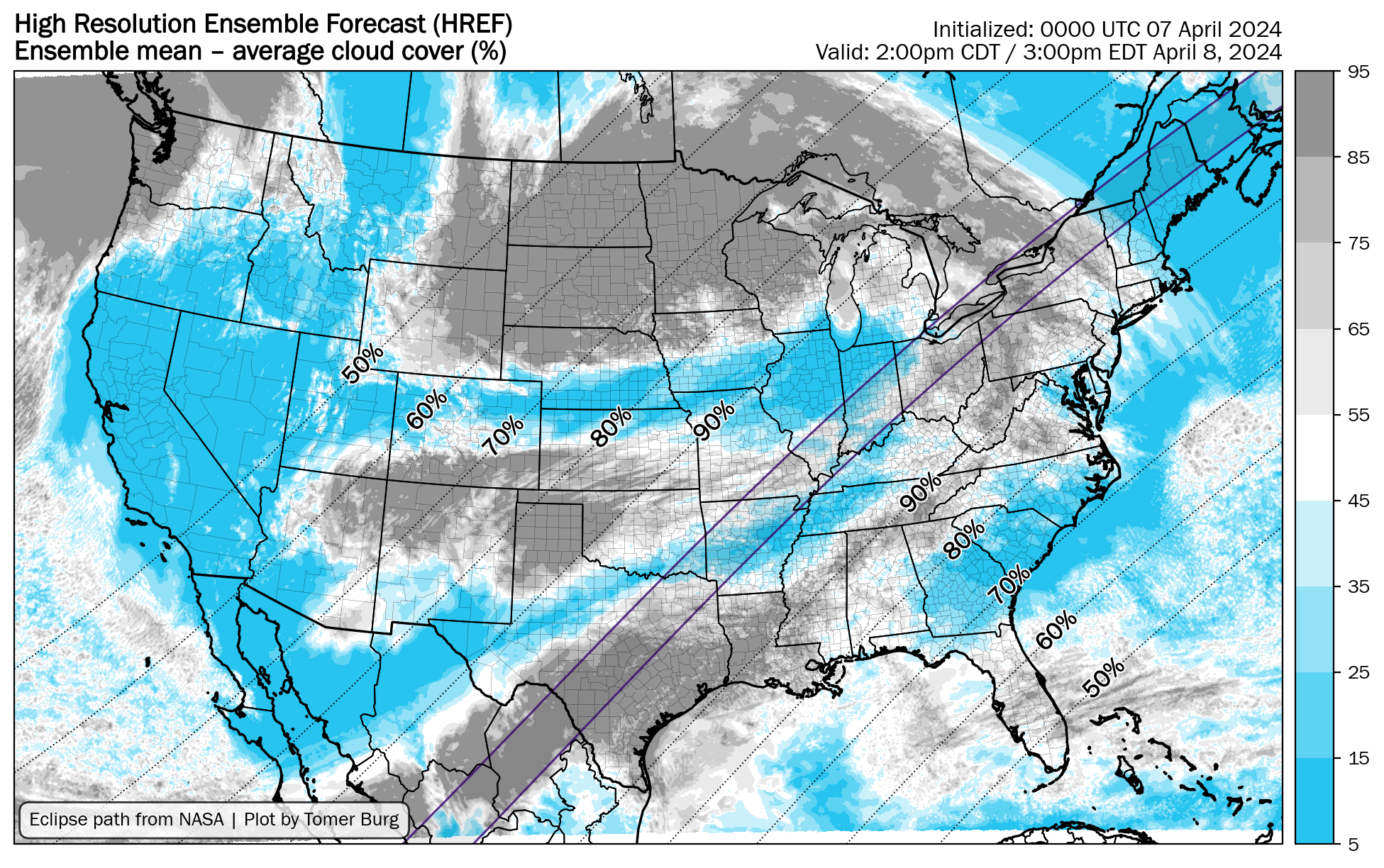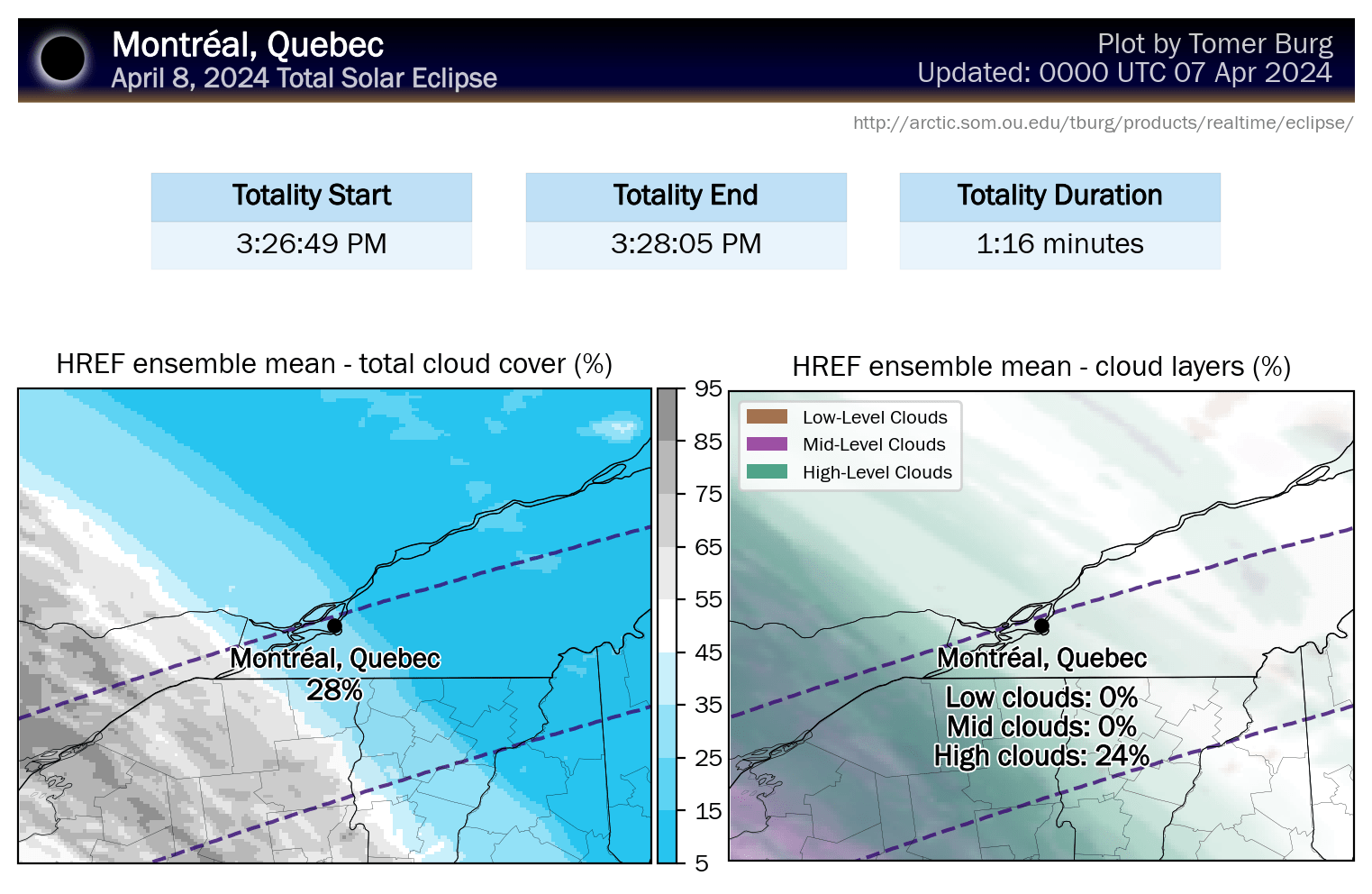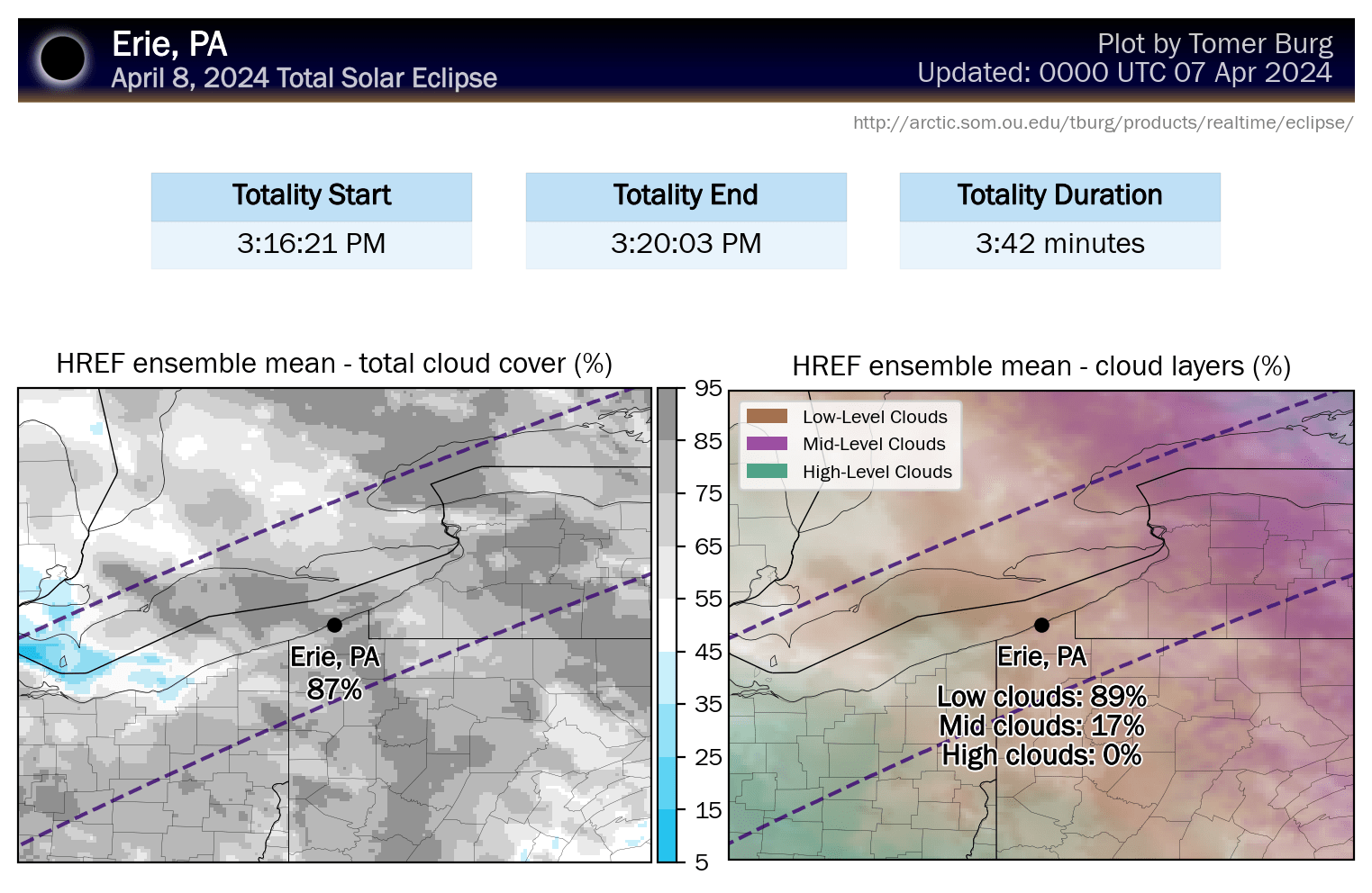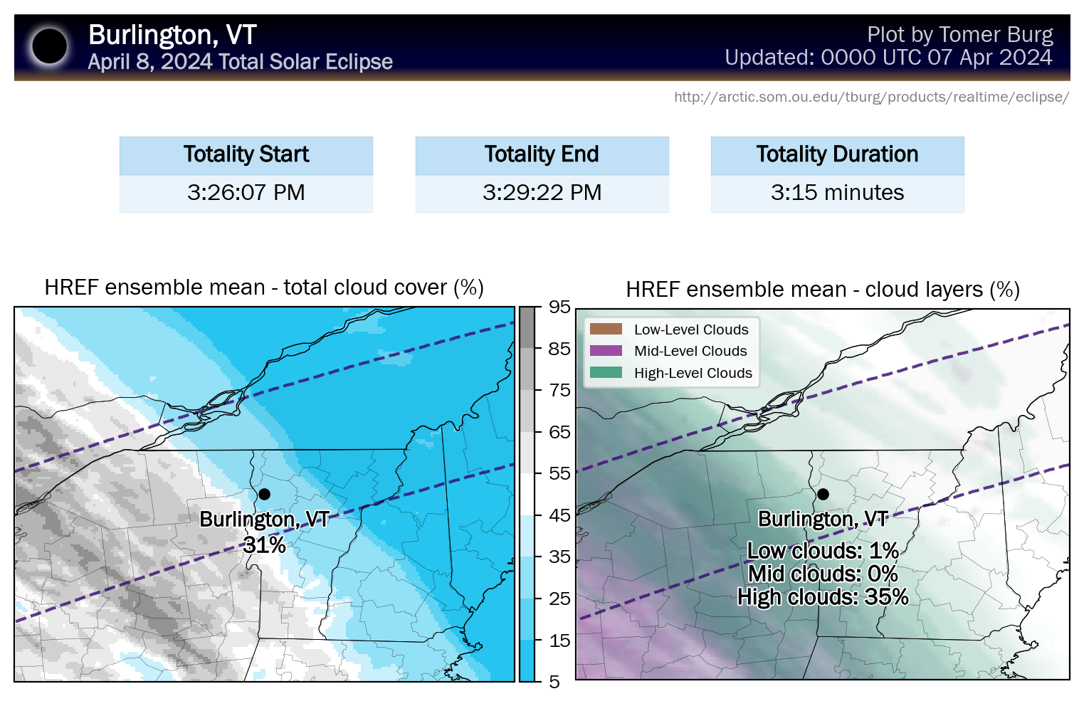 Tomer Burg has updated his maps to use mesoscale models now that they are within range. He has also created new maps from the HREF ensembles that differentiate low, middle, and high clouds as they have varying levels of effect, with high clouds being the least troublesome.